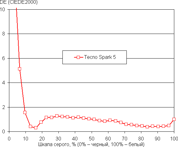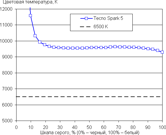 Баланс оттенков на шкале компромиссный, так как цветовая температура существенно выше стандартных 6500 К, но отклонение от спектра абсолютно черного тела (ΔE) ниже 2, что для потребительского устройства считается отличным показателем. При этом цветовая температура и ΔE мало изменяются от оттенка к оттенку — это положительно сказывается на визуальной оценке цветового баланса. (Самые темные области шкалы серого можно не учитывать, так как там баланс цветов не имеет большого значения, да и погрешность измерений цветовых характеристик на низкой яркости большая.)