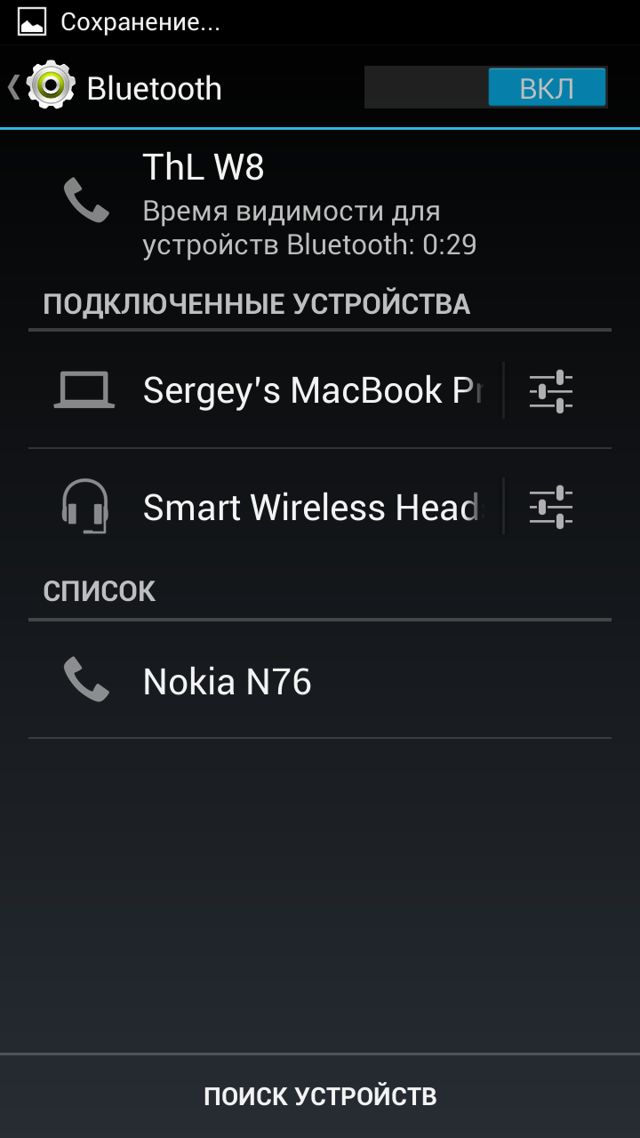 Модуль Bluetooth был успешно проверен в нескольких режимах: передача файла (с достигнутой скоростью 1,6 Мбит/с), работа в качестве модема и выход в интернет с ноутбука посредством смартфона, подключение к беспроводной стереогарнитуре Sony MW1. Возможности гарнитуры в связке с ThL W8 остались на стандартном уровне: телефонные вызовы с демонстрацией номера абонента вместо его имени в записной книжке, воспроизведение музыки без названия треков.