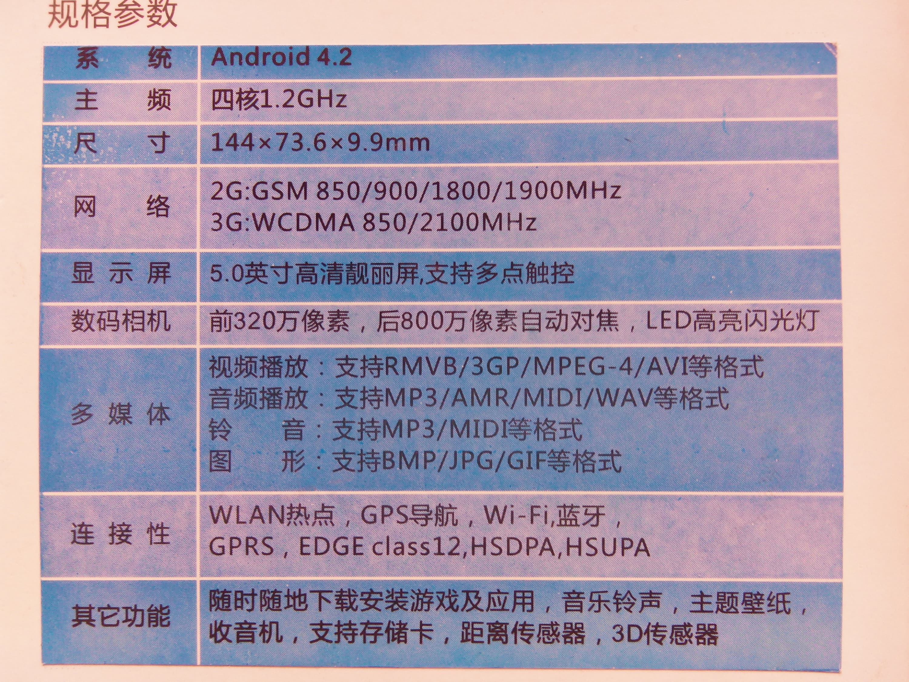Смартфон ThL W8 поставляется в коробке средних размеров, изготовленной из плотного белого картона. Все надписи и документация даны на китайском языке, и почерпнуть какие-либо подробности о возможностях мобильного компьютера можно лишь по немногочисленным надписям латиницей и стандартным значкам технологий. Некоторая информация на упаковке и вовсе не соответствовала действительности: так, в тестируемом смартфоне версия ОС Android — 4.1.2 (а не 4.2), а разрешение встроенной камеры равно 12 мегапикселям, а не 8, как это было указано на коробке.