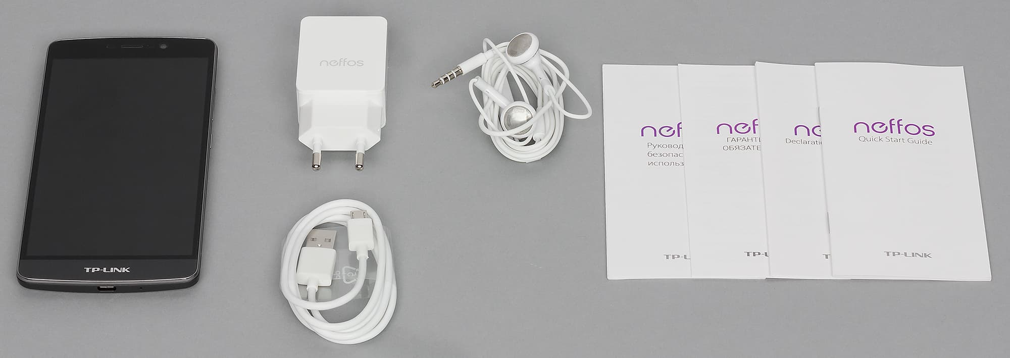 Комплект состоит из зарядного устройства с максимальным выходным током 2 А при напряжении 5 В, соединительного кабеля Micro-USB, простеньких наушников без резиновых амбушюр и нескольких книжиц бумажной документации.