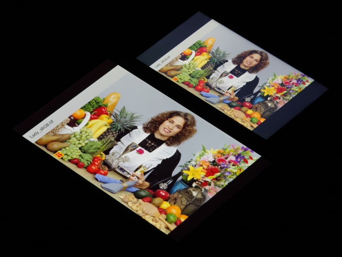 В итоге цвета имеют естественную насыщенность. Баланс оттенков на шкале серого хороший, так как цветовая температура пусть и выше стандартных 6500 К, но отклонение от спектра абсолютно черного тела (ΔE) ниже 10, что для потребительского устройства считается приемлемым показателем. При этом цветовая температура и ΔE мало изменяются от оттенка к оттенку — это положительно сказывается на визуальной оценке цветового баланса. (Самые темные области шкалы серого можно не учитывать, так как там баланс цветов не имеет большого значения, да и погрешность измерений цветовых характеристик на низкой яркости большая.)