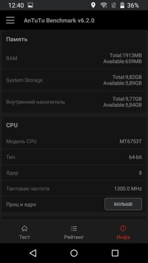 Аппаратная платформа TP-Link Neffos C5 Max строится на базе восьмиядерной однокристальной системы (SoC) MediaTek MT6753. В конфигурацию SoC входят восемь процессорных ядер Cortex-A53, работающих на частоте до 1,3 ГГц. За обработку графики отвечает видеоускоритель Mali-T720. Объем ОЗУ составляет 2 ГБ, из 16 ГБ внутреннего хранилища владельцу остается не более 10 ГБ. Есть возможность установки карт памяти microSD, и для этого не придется жертвовать ни одной из SIM-карт. На практике наша проверочная карта Transcend Premium microSDXC UHS-1 объемом 128 ГБ была успешно распознана устройством.