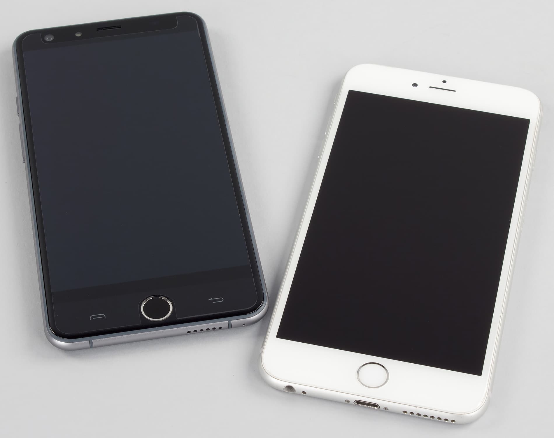 Что касается дизайна самого смартфона, то здесь двух мнений быть не может: Ulefone Be Touch по внешнему виду является точной копией Apple iPhone 6 Plus. Создается стойкое впечатление, будто китайские дизайнеры просто сняли с него все мерки и слепили смартфон по ним. Все габаритные размеры, радиус закругления углов, расположение и форма всех элементов на передней панели, заметно скругленные боковые грани — все здесь точно такое же, как у американского «прототипа».
