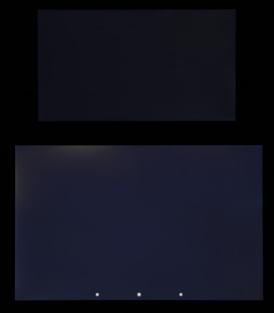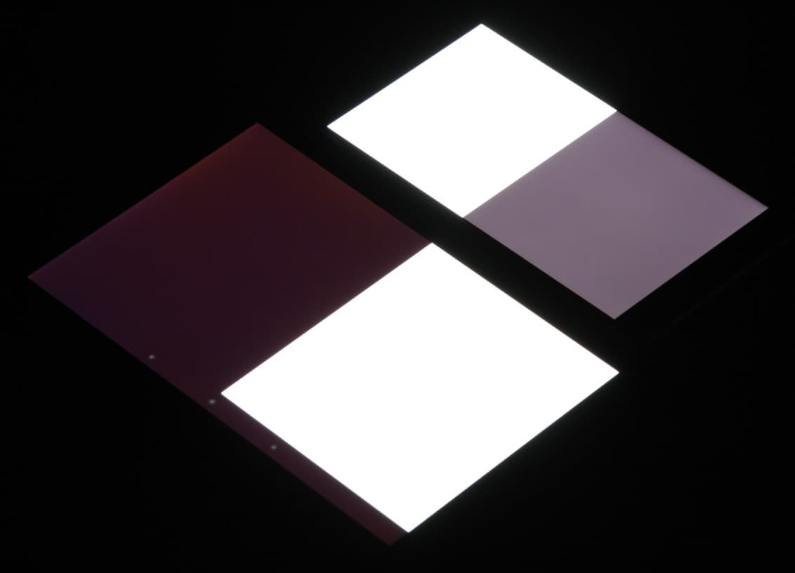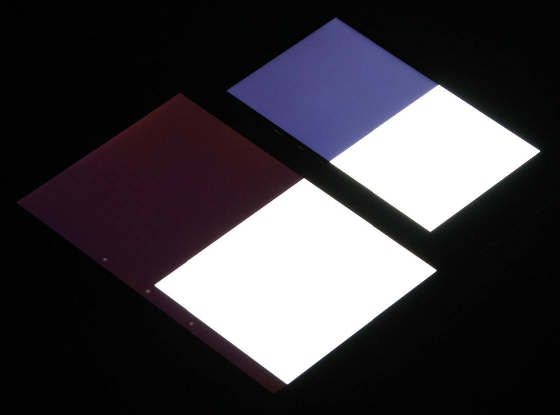 Яркость под углом у экранов уменьшилась (как минимум в 4 раза, исходя из разницы в выдержке), но у Ulefone Be Touch экран заметно светлее (средняя яркость по фотографиям 241 против 215 у Nexus 7). Черное поле при отклонении по диагонали высветляется сильно и приобретает фиолетовый или красно-фиолетовый оттенок. Фотографии ниже это демонстрируют (яркость белых участков в перпендикулярном плоскости экранов направлении одинаковая!):