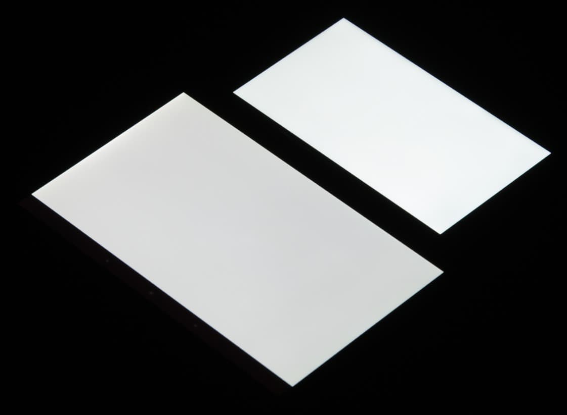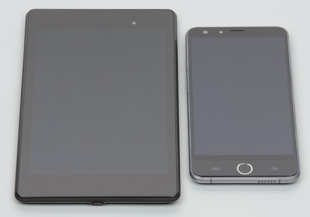 Лицевая поверхность экрана выполнена в виде стеклянной пластины с зеркально-гладкой поверхностью, устойчивой к появлению царапин. Судя по отражению объектов антибликовые свойства экрана не хуже, чем у экрана Google Nexus 7 (2013) (далее просто Nexus 7). Для наглядности приведем фотографию, на которой в выключенных экранах отражается белая поверхность (слева — Nexus 7, справа — Ulefone Be Touch, далее их можно различать по размеру):