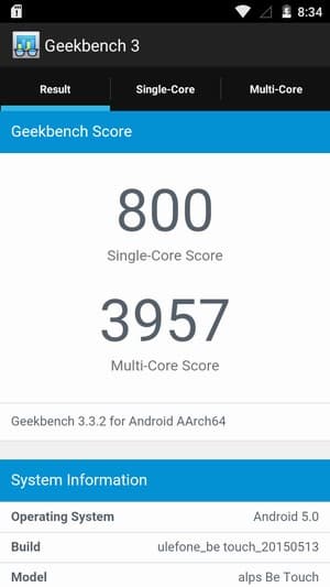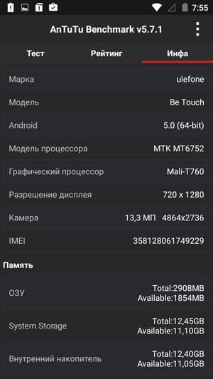 Аппаратная платформа Ulefone Be Touch строится на базе свежей восьмиядерной однокристальной системы (SoC) MediaTek MT6752. В конфигурацию новой SoC входит восемь полноценных процессорных ядер, только здесь используются более производительные ядра Cortex-A53, в отличие от применявшихся в прошлом поколении платформ MediaTek ARM Cortex-A7. Эта 64-битная платформа выполнена по техпроцессу 28 нм, максимальная частота ядер достигает 1,7 ГГц. За обработку графики здесь отвечает мощный и современный видеоускоритель Mali-T760. Объем ОЗУ составляет целых 3 ГБ, а собственной памяти для нужд пользователя в устройстве доступно около 11,5 ГБ из номинально обозначенных 16 ГБ.