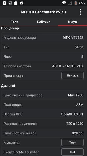 - SoC MediaTek MT6752, 1,7 ГГц, 8 ядер, ARM Cortex-A53