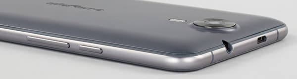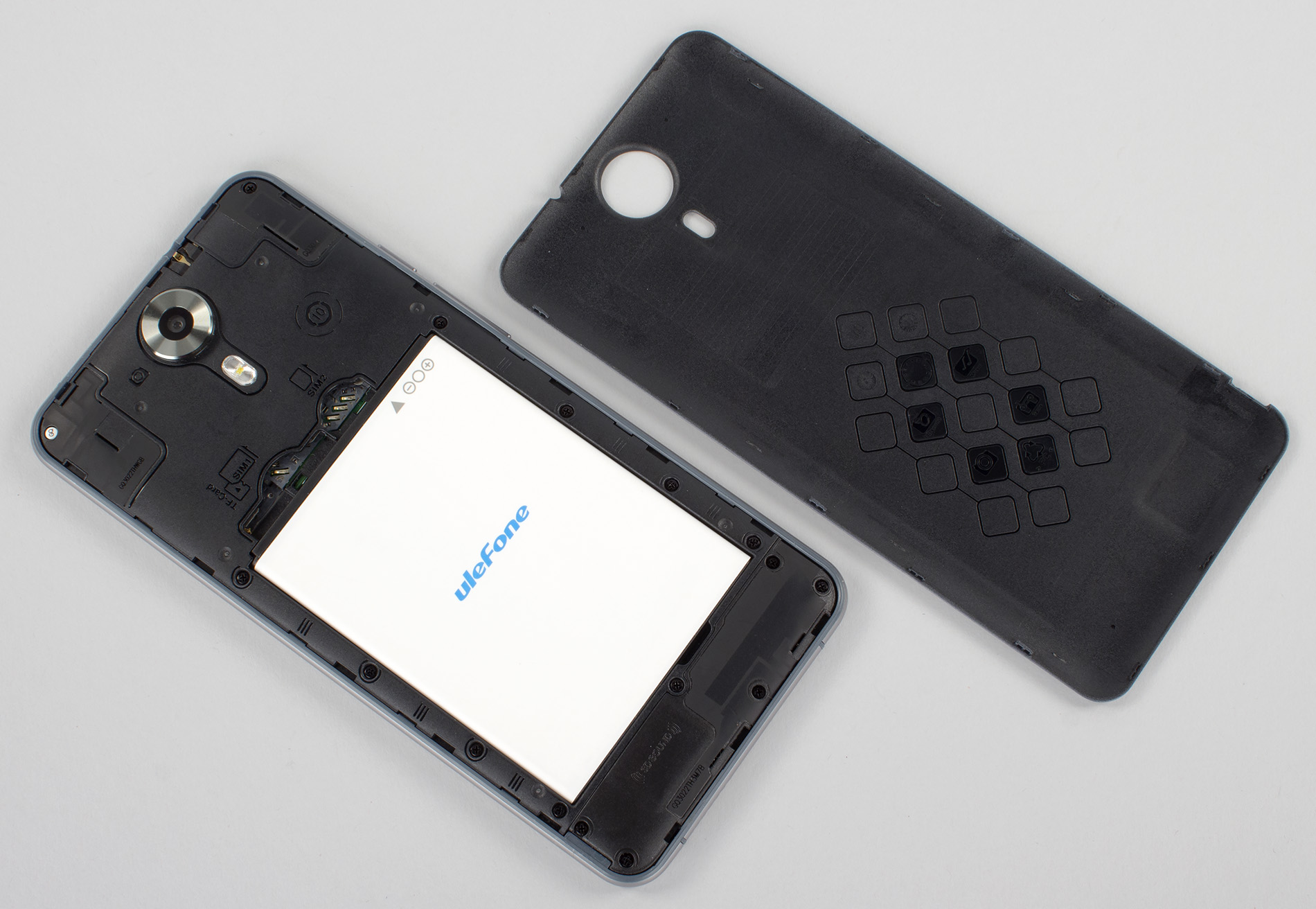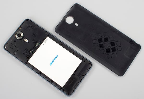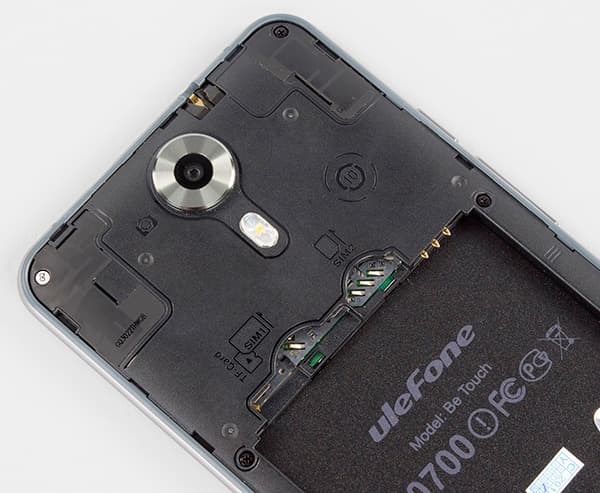Все пластиковые поверхности у корпуса смартфона имеют матовое, немаркое покрытие, так что отпечатков на задней стенке и боковинах практически не остается. Корпус Ulefone Be Touch выполнен в виде моноблока со съемной задней крышкой, и крышка эта снимается чрезвычайно тяжело. Настолько тяжело, что с помощью собственных ногтей это делать проблематично и даже больно — приходится прибегать к каким-нибудь дополнительным инструментам. Это, кстати, заметный недостаток, который был присущ и предыдущей побывавшей у нас на тестировании модели Ulefone. С другой стороны, за счет такой жесткой посадки крышка сидит на своем месте как влитая, надежно удерживается на корпусе, при сжатии никаких скрипов и хруста не слышно, корпус создает впечатление надежной монолитности.