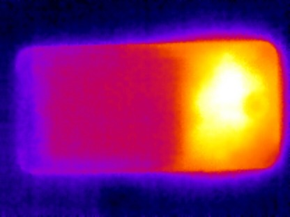 Ниже приведен теплоснимок задней поверхности (верх на снимке — справа), полученный после 10 минут работы теста аккумулятора в программе GFXBenchmark: