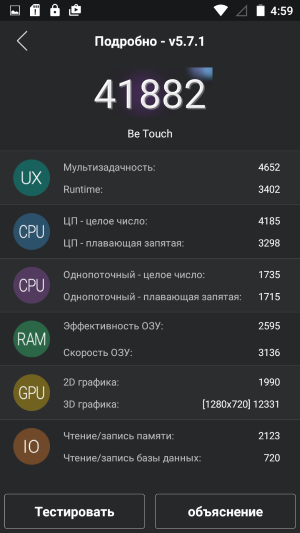 Литий-полимерная батарея, установленная в Ulefone Be Touch, имеет среднего уровня емкость в 2550 мА·ч — по крайней мере, так указано в официальных спецификациях. Протестированному аппарату не удалось продемонстрировать каких-либо выдающихся показателей в тестах, все в пределах усредненной нормы или даже чуть ниже. На этом месте стоит заметить, что из-за появления в пятой версии OC Android собственного штатного энергосберегающего режима таких режимов в китайских смартфонах на платформах MediaTek теперь стало два.