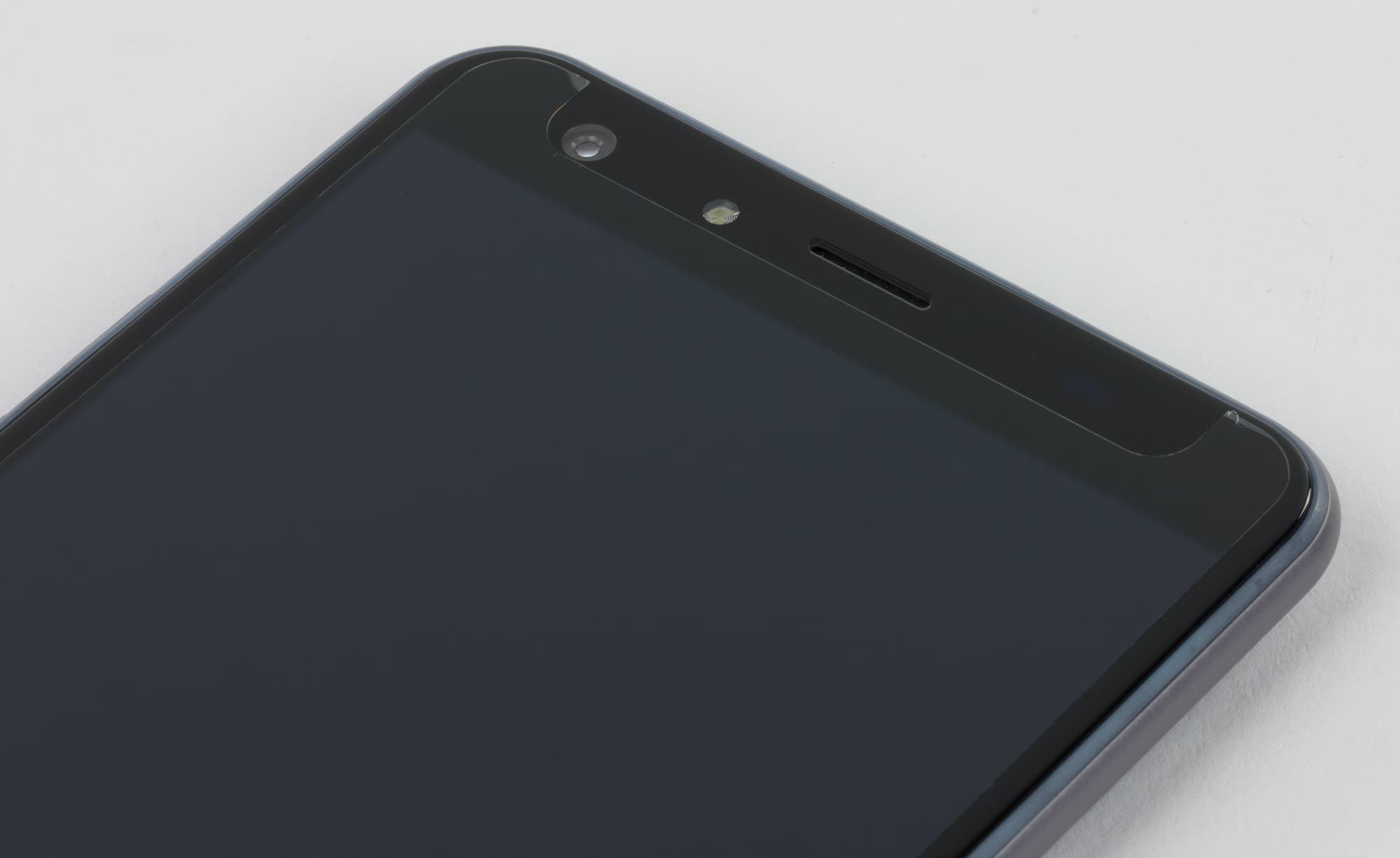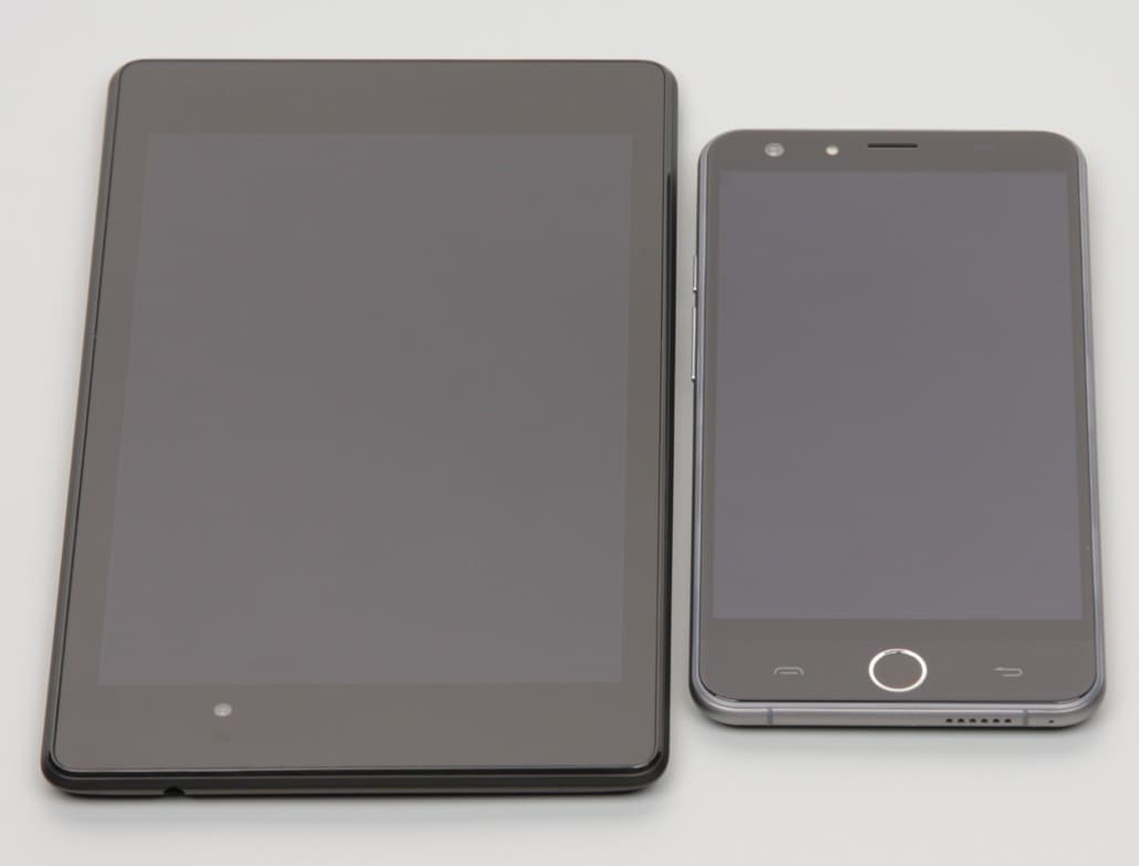 Лицевая поверхность экрана выполнена в виде стеклянной пластины с зеркально-гладкой поверхностью, устойчивой к появлению царапин. Судя по отражению объектов антибликовые свойства экрана не хуже, чем у экрана Google Nexus 7 (2013) (далее просто Nexus 7). Для наглядности приведем фотографию, на которой в выключенных экранах отражается белая поверхность (слева — Nexus 7, справа — Ulefone Be Touch 2, далее их можно различать по размеру):