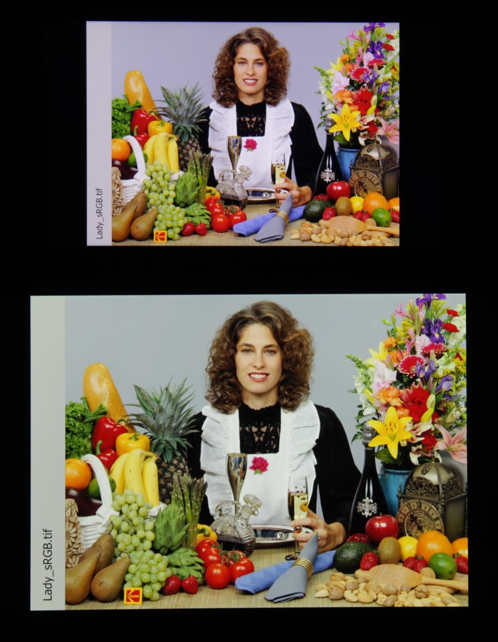 Отметим хорошую равномерность яркости и цветового тона белого поля, а также существенный уход оттенка от чисто белого цвета. И тестовая картинка: