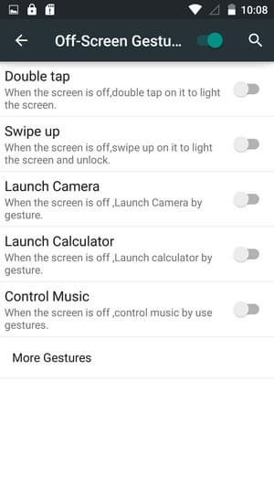 Из особенностей: имеется поддержка управления жестами, все настройки по работе с жестами выделены в отдельный раздел меню. Сюда вошли такие ставшие привычными уже функции, как активация экрана с помощью рисования букв латинского алфавита, привязанных к определенным программам (например, «С» для быстрого вызова камеры и т. д.). Этот самый добавленный раздел и оказался полностью непереведенным на русский, даже при установленном русскоязычном интерфейсе.