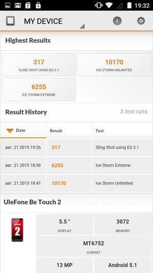 Съемная аккумуляторная батарея, установленная в Ulefone Be Touch 2, имеет номинально достаточно большую емкость в 3050 мА·ч. Однако наш тестовый аппарат продемонстировал на удивление скромные результаты во всех стандартных тестовых сценариях, при этом результаты перепроверялись несколько раз. То ли реальная емкость батареи на самом деле меньше заявленной, то ли нам попался на тест бракованный экземпляр аппарата, но полученные данные красноречиво говорят сами за себя.