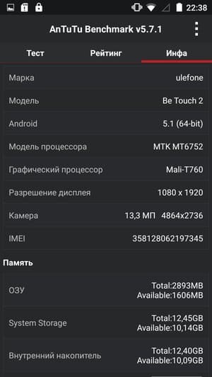 Аппаратная платформа Ulefone Be Touch 2 не изменилась со времен первой модели Be Touch. Смартфон все так же строится на базе одной из лучших современных среднеуровневых SoC, восьмиядерной однокристальной системы (SoC) MediaTek MT6752. В конфигурацию данной SoC входит восемь полноценных процессорных ядер Cortex-A53. Эта 64-битная платформа выполнена по техпроцессу 28 нм, максимальная частота ядер достигает 1,7 ГГц. За обработку графики отвечает мощный видеоускоритель Mali-T760. Объем ОЗУ составляет 3 ГБ, а собственной памяти для нужд пользователя в устройстве доступно около 11,5 ГБ из номинальных 16 ГБ. Для наращивания объема памяти предусмотрен разъем для карт microSD, также поддерживается подключение внешних флэш-накопителей через OTG-переходник.
