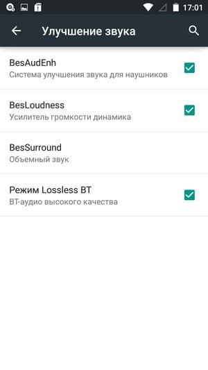 Для управления качеством звучания имеется возможность задействовать знакомые усилитель громкости динамика BesLoudness и систему улучшения звука для наушников BesAudEnh. Для воспроизведения мелодий в смартфоне используется штатный аудиоплеер с возможностью выбора из нескольких предустановленных значений эквалайзера. В штатном плеере предусмотрен режим проигрывания lossless-форматов.