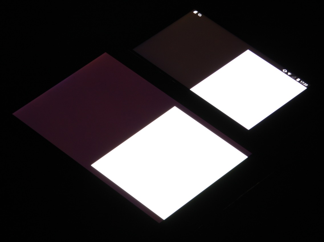 Яркость под углом у экранов уменьшилась (как минимум в 5 раз, исходя из разницы в выдержке), но у Ulefone Be Touch 2 экран чуть-чуть темнее (средняя яркость по фотографиям 230 против 234 у Nexus 7). Черное поле при отклонении по диагонали высветляется слабо и приобретает красно-фиолетовый оттенок. Фотографии ниже это демонстрируют (яркость белых участков в перпендикулярном плоскости экранов направлении одинаковая!):