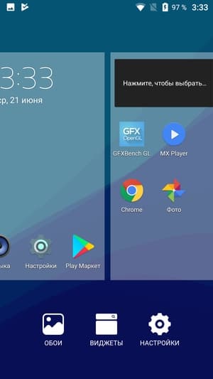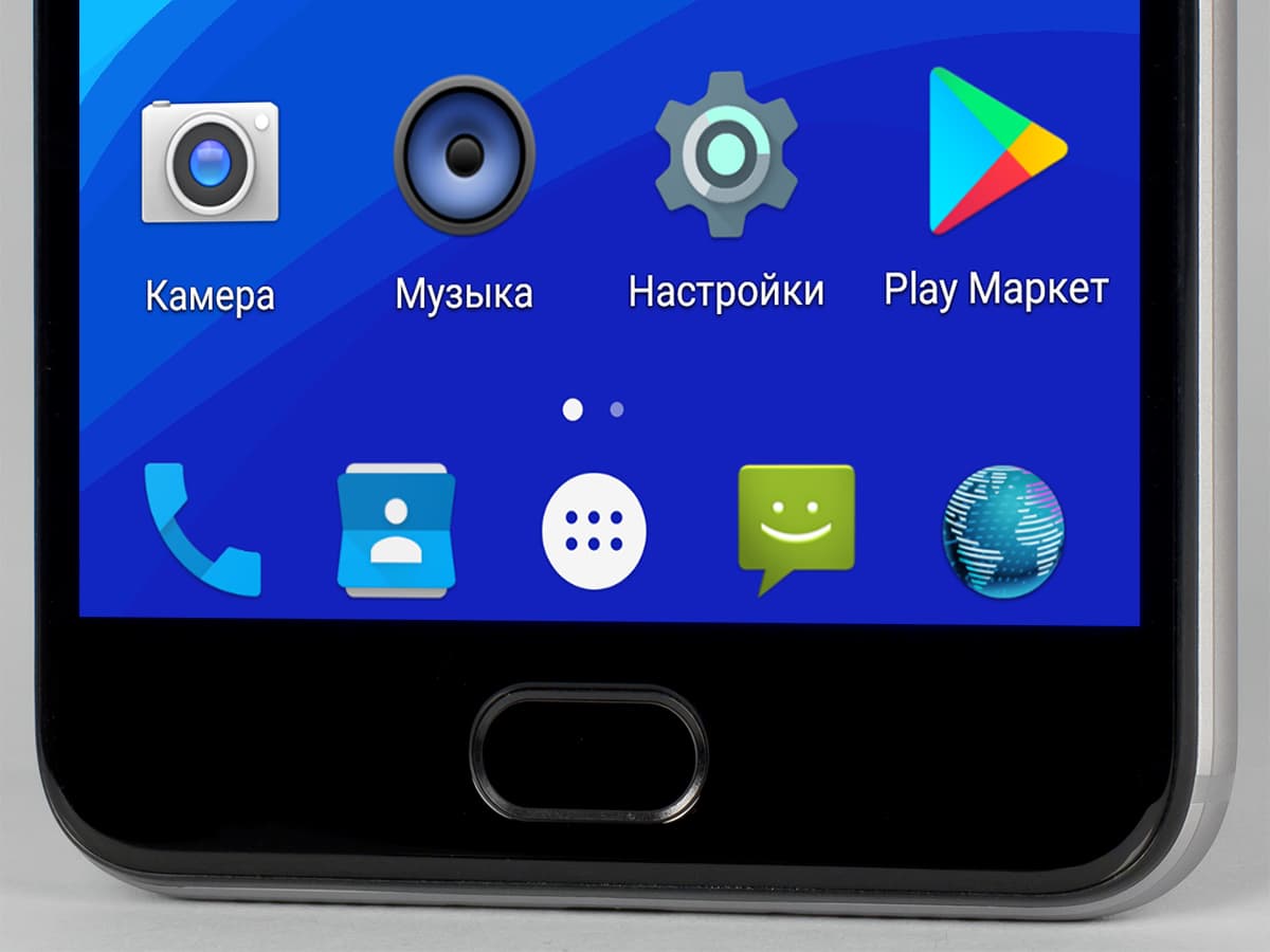 В нижней части есть три сенсорных кнопки, одна из которых снабжена дактилоскопическим датчиком. Центральная кнопка с интегрированным сканером отпечатков пальцев не является механической, нажать ее нельзя (это просто углубление в стекле). Тем не менее, это именно сенсорная кнопка, короткое прикосновение к которой открывает домашний экран, а длительное — открывает список запущенных программ. Кнопки по бокам отрабатывают функции возврата к предыдущему экрану и настройки рабочих столов. Сенсорные кнопки можно отключить и использовать только их экранные аналоги, которые можно расставить на свой вкус в настройках системы.