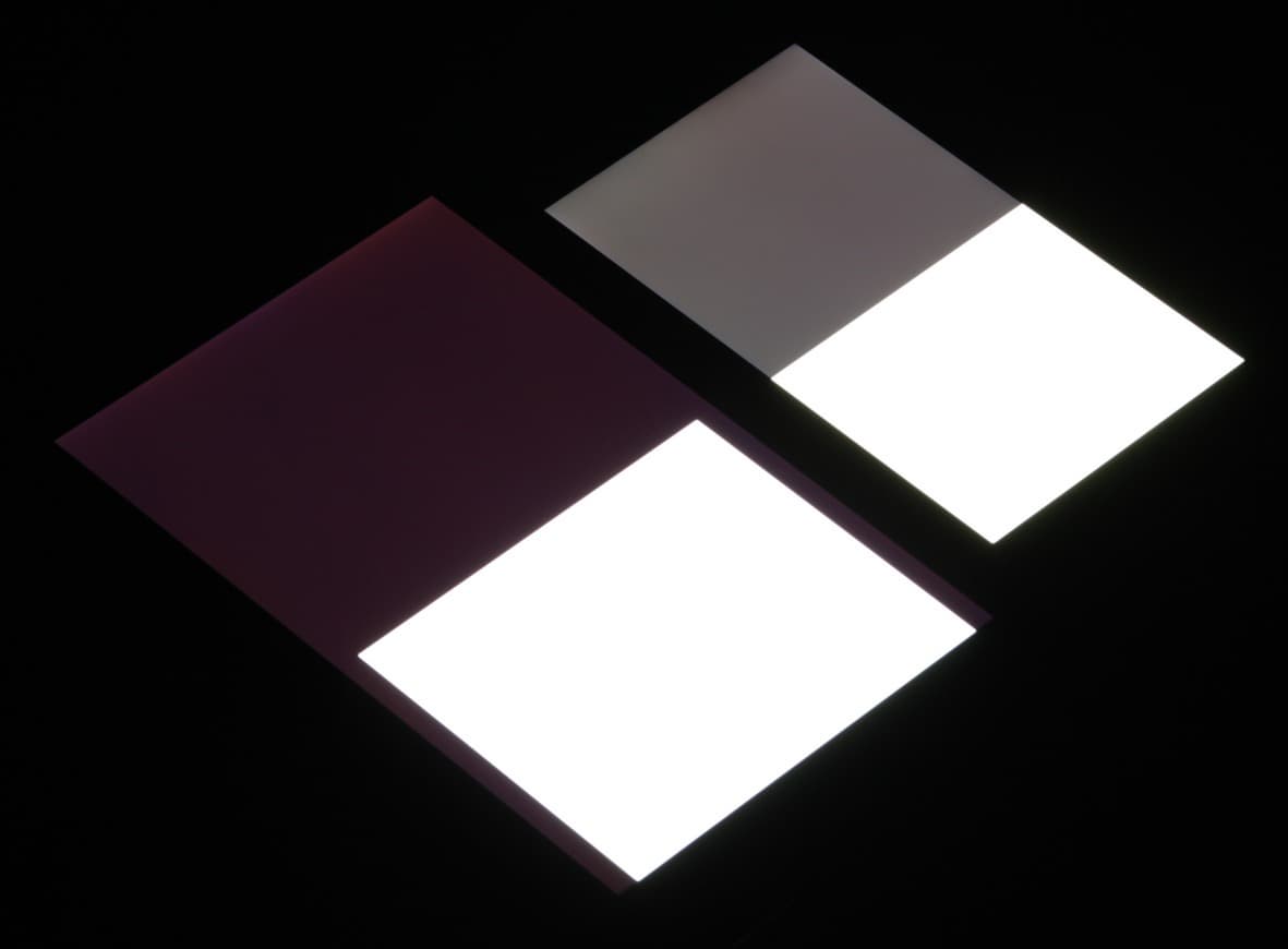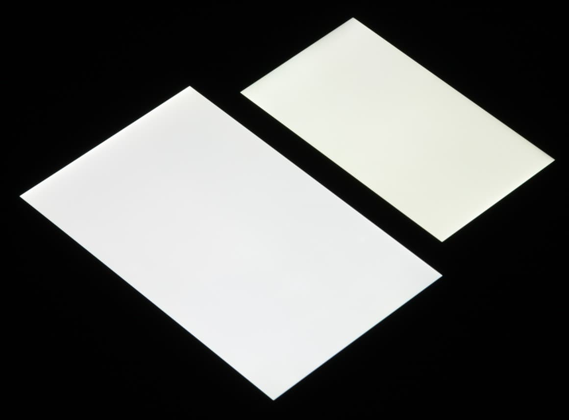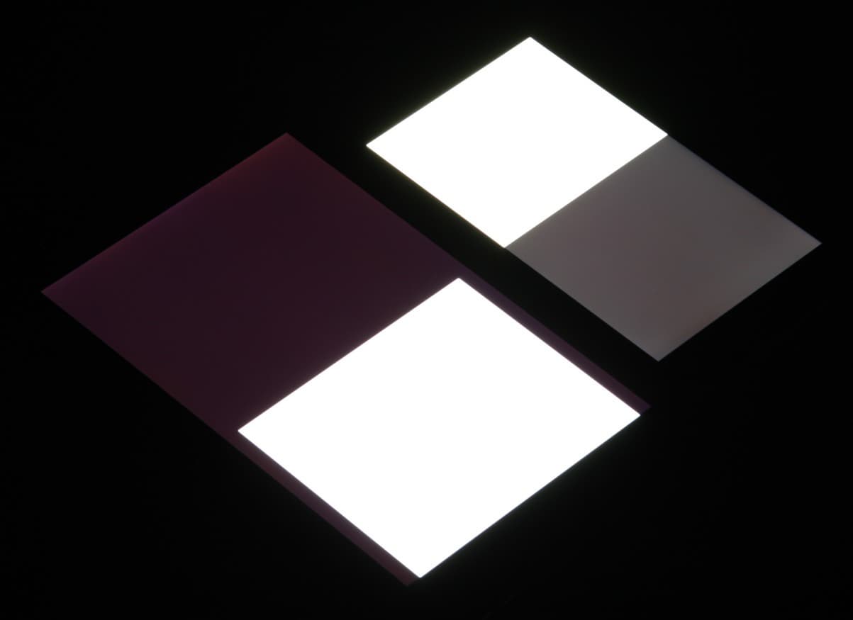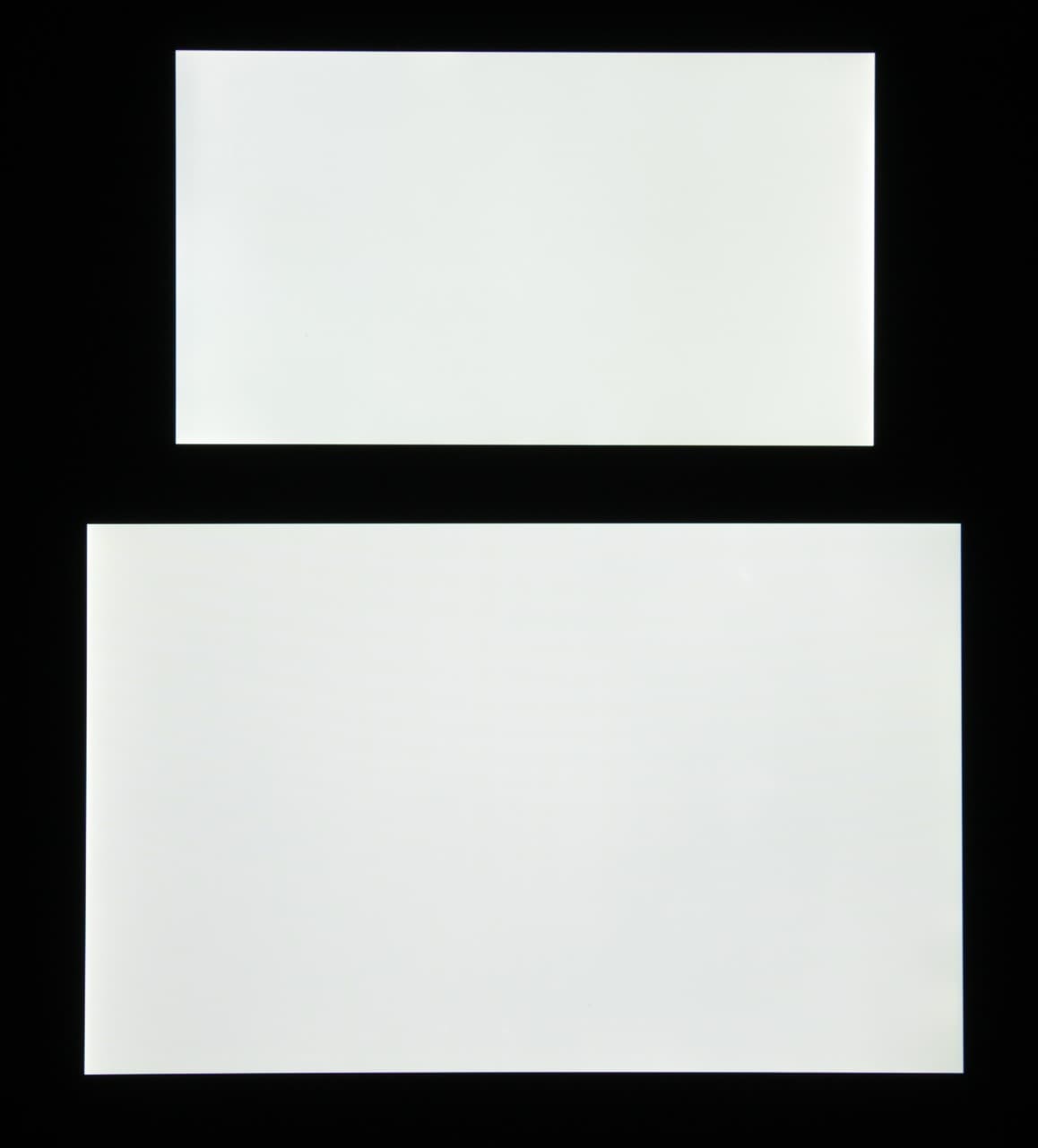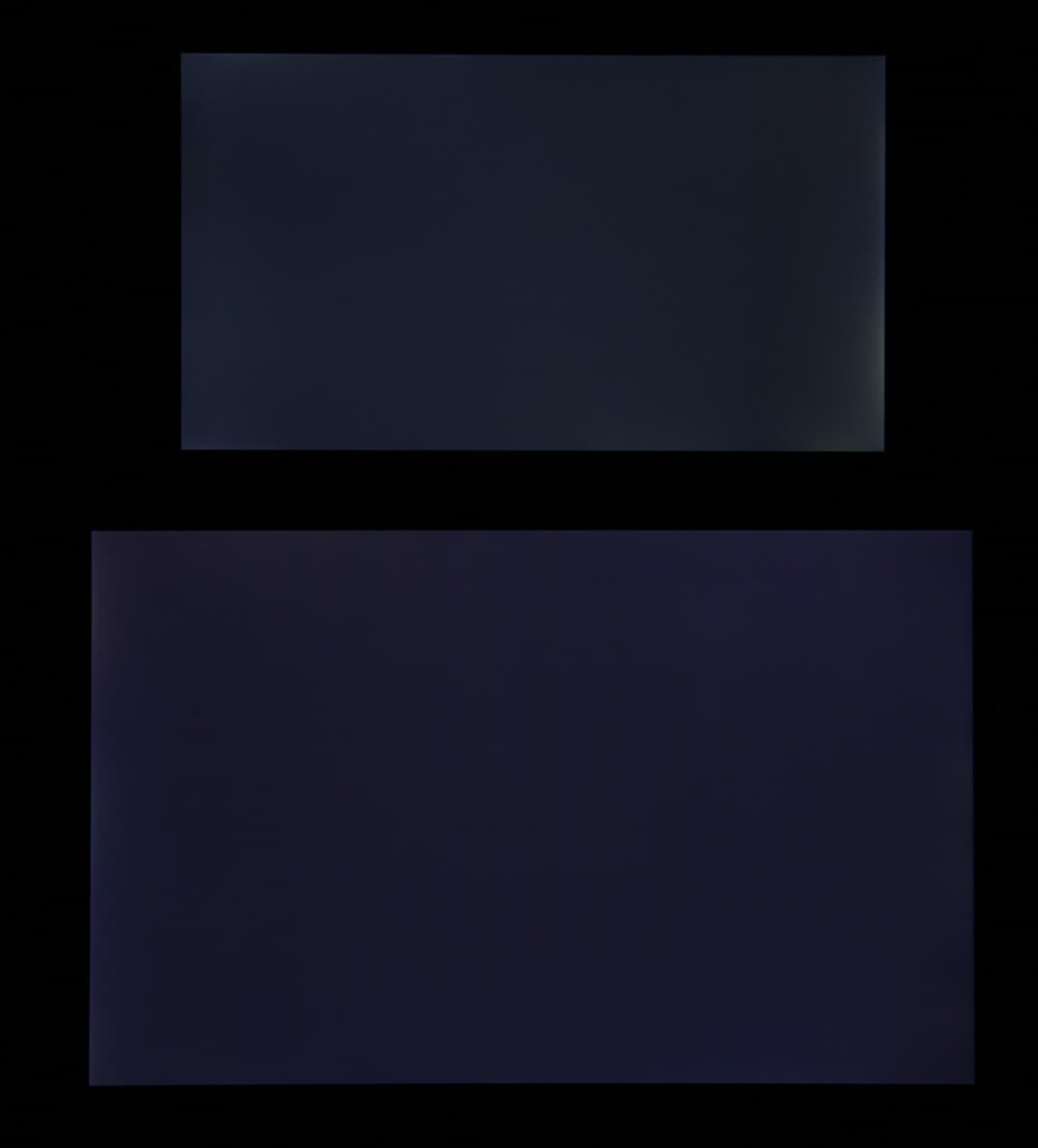 Яркость под углом у экранов уменьшилась (как минимум в 5 раз, исходя из разницы в выдержке), и уменьшилась примерно одинаково. Черное поле при отклонении по диагонали высветляется сильно и приобретает красноватый оттенок. Фотографии ниже это демонстрируют (яркость белых участков в перпендикулярном плоскости экранов направлении одинаковая!):