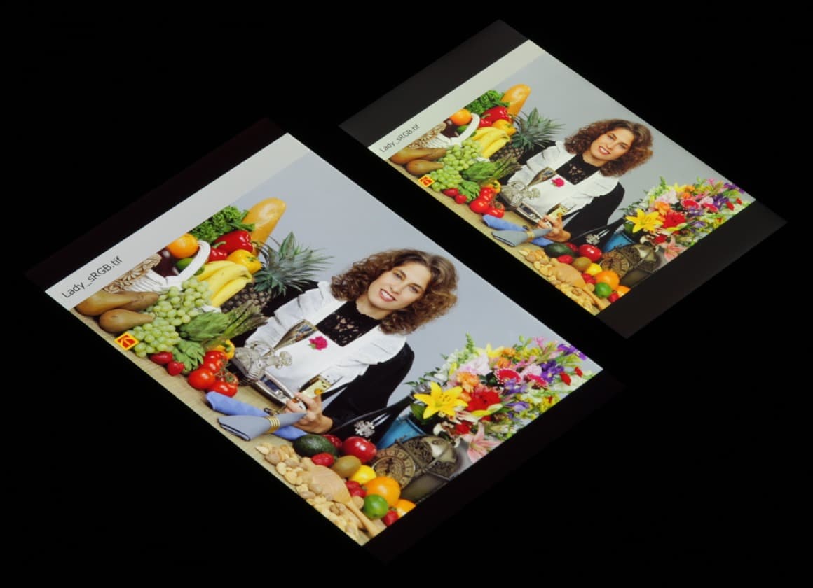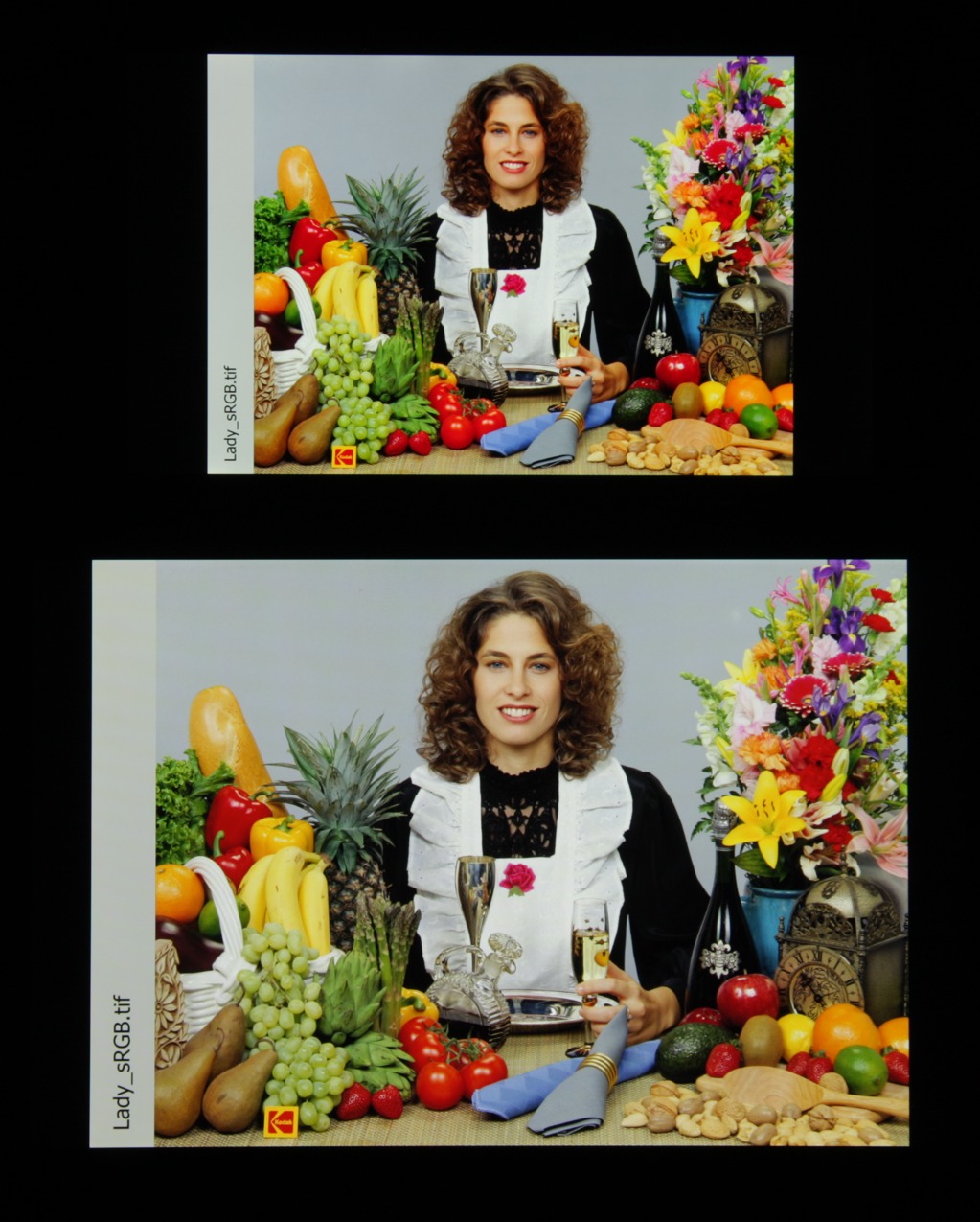 Такое мы уже видели в случае, например, Sony Xperia Z2 и других мобильных устройств. Sony указывает, что в этих экранах используются светодиоды с синим излучателем и зеленым и красным люминофором (обычно — синий излучатель и желтый люминофор), что в сочетании со специальными светофильтрами матрицы и позволяет получить широкий цветовой охват. Да, и в красном люминофоре, видимо, используются так называемые квантовые точки. Для потребительского устройства широкий цветовой охват является никак не достоинством, а существенным недостатком, поскольку в итоге цвета изображений — рисунков, фотографий и фильмов, — ориентированных на пространство sRGB (а таких подавляющее большинство), имеют неестественную насыщенность. Особенно это заметно на узнаваемых оттенках, например на оттенках кожи. Результат приведен на фотографии выше.