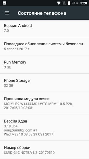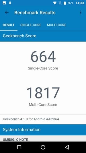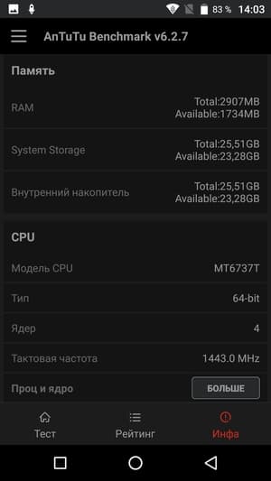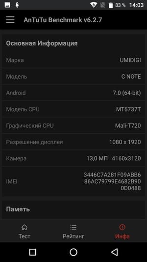 Аппаратная платформа Umidigi C Note строится на базе SoC MediaTek MT6737Т, выполненной по техпроцессу 28 нм. Это чуть более продвинутая модификация базовой MT6737, в конфигурацию этой 64-битной платформы входят 4 процессорных ядра Cortex-A53, работающих на частоте до 1,44 ГГц. За обработку графики отвечает видеоускоритель Mali-T720 с двумя ядрами частотой до 600 МГц. Объем ОЗУ равняется 3 ГБ, а пользовательское хранилище составляет 32 ГБ. Из них в реальности свободно около 1,9 ГБ ОЗУ и примерно 25,5 ГБ флэш-памяти. Есть возможность подключения внешних флэш-накопителей в режиме USB OTG.