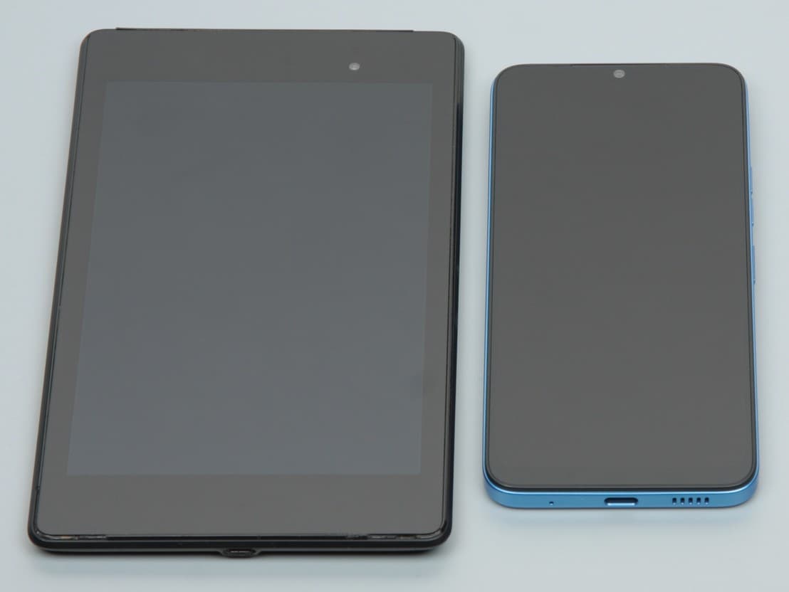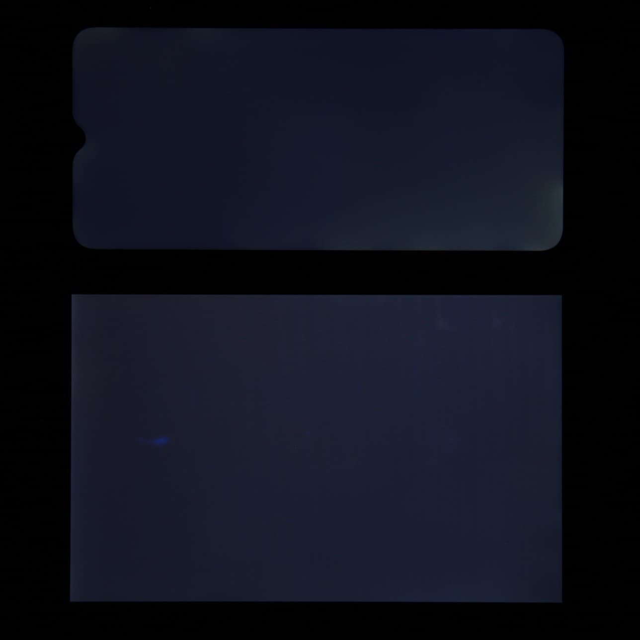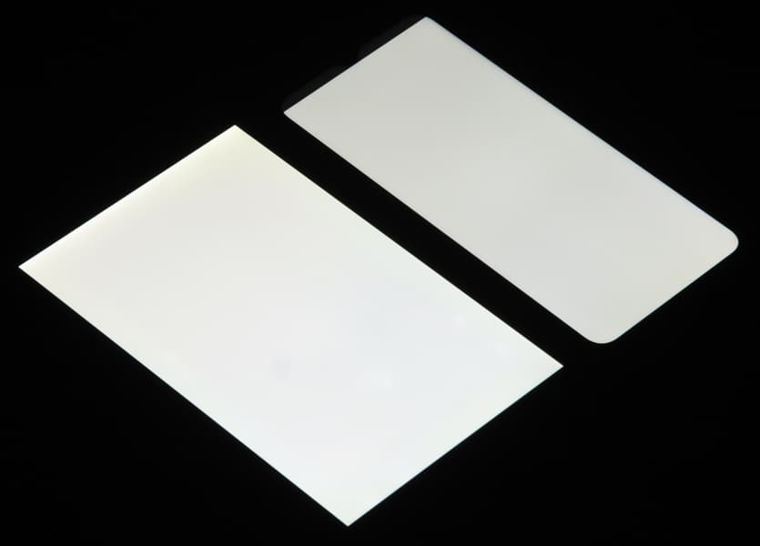 Лицевая поверхность экрана выполнена в виде стеклянной пластины с зеркально-гладкой поверхностью, устойчивой к появлению царапин. Судя по отражению объектов, антибликовые свойства экрана лучше, чем у экрана Google Nexus 7 (2013) (далее просто Nexus 7). Для наглядности приведем фотографию, на которой в выключенных экранах отражается белая поверхность (слева — Nexus 7, справа — Umidigi G1 Max, далее их можно различать по размеру):