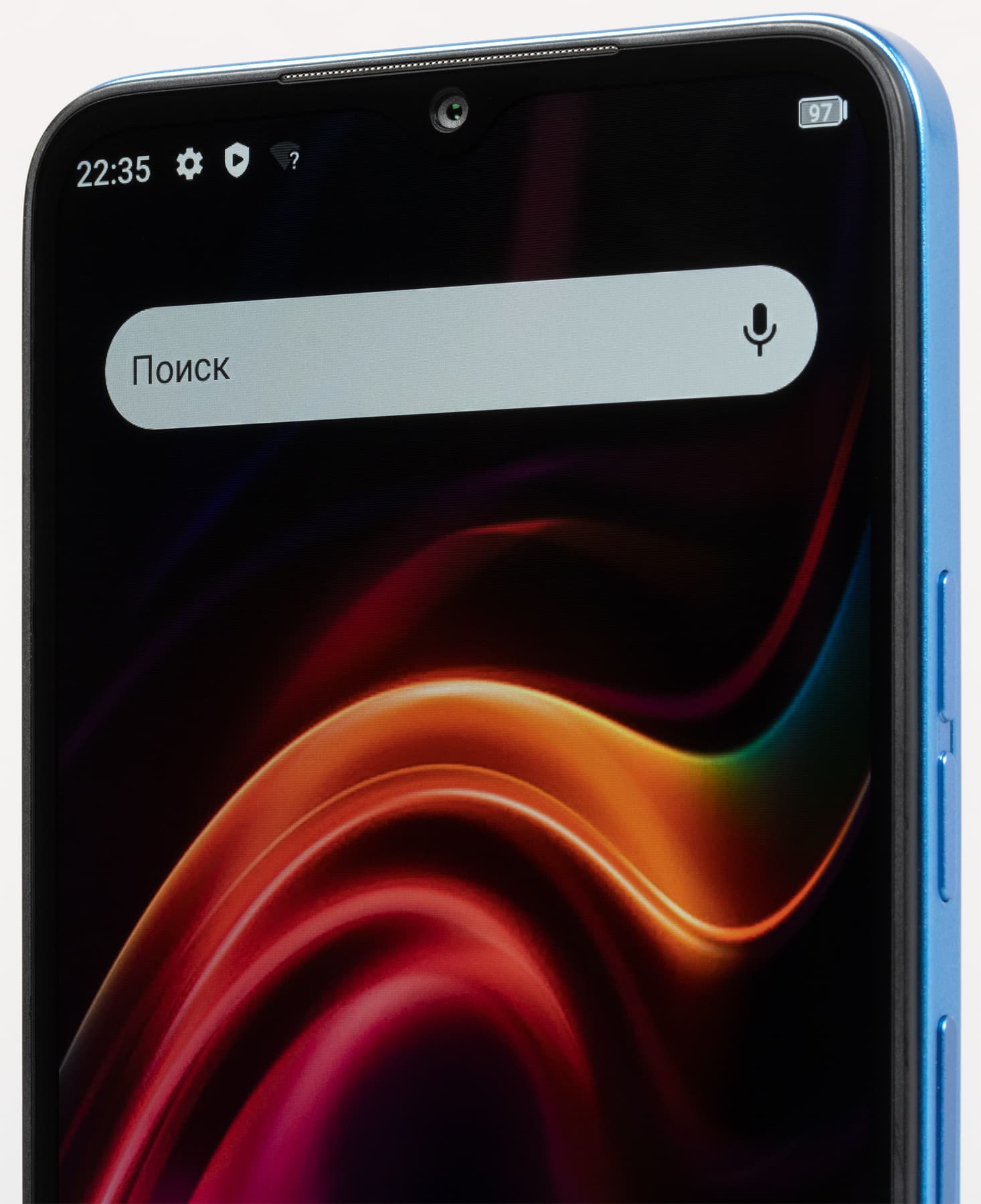 Фронтальная камера установлена за каплевидным вырезом в матрице экрана — прямо по центру. Светодиодного индикатора событий нет.