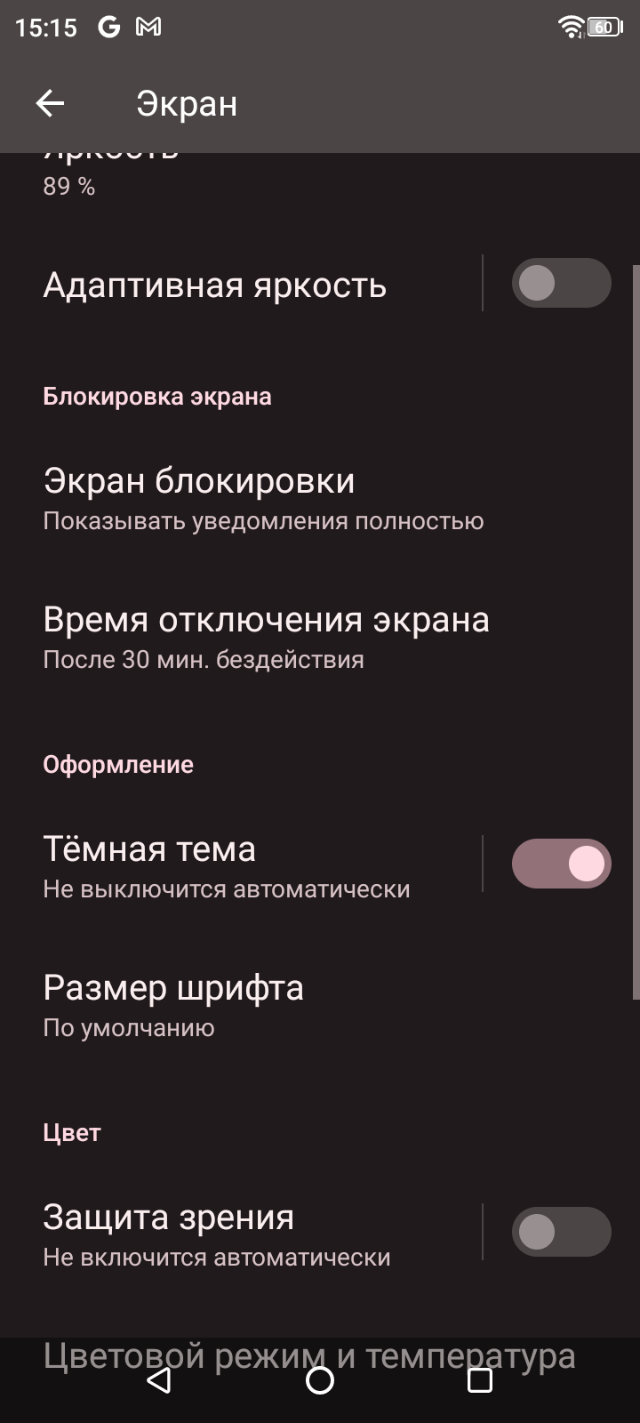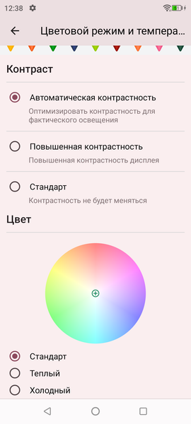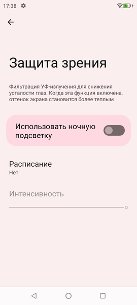 При ручном управлении яркостью и при выводе белого поля во весь экран максимальное значение яркости составило всего около 380 кд/м². Максимальная яркость невысокая, но, учитывая отличные антибликовые свойства, смартфоном как-то можно будет пользоваться даже в солнечный день вне помещения. Минимальное значение яркости — 22 кд/м² при ручном управлении, поэтому в полной темноте яркость можно понизить до комфортного значения. В наличии автоматическая регулировка яркости по датчику освещенности (он находится справа от решетки фронтального громкоговорителя у верхнего края фронтальной панели). В автоматическом режиме при изменении внешних условий освещенности яркость экрана как повышается, так и понижается. Работа этой функции зависит от положения ползунка регулировки яркости: им пользователь может попытаться выставить желаемый уровень яркости в текущих условиях. Если не вмешиваться, то в полной темноте функция автояркости уменьшает яркость до 12 кд/м² (сойдет), в условиях освещенного искусственным светом офиса (примерно 550 лк) устанавливает на 380 кд/м² (излишне ярко), под очень ярким светом, условно на прямом солнечном свету повышает до 380 кд/м² (до максимума, так и нужно). Результат по умолчанию нас удовлетворил, но для эксперимента мы попробовали повысить (понизить уже нельзя) яркость в полной темноте. В темноте яркость стала выше, но завышение яркости экрана в «офисе» никуда не делось. Происходит это из-за того, что датчик освещенности выдает сильно завышенные показания. Получается, что функция автоподстройки яркости работает не совсем адекватно, но все же позволяет пользователю хоть как-то настраивать свою работу под индивидуальные требования. На любом уровне яркости значимая модуляция подсветки отсутствует, поэтому нет и никакого мерцания экрана.