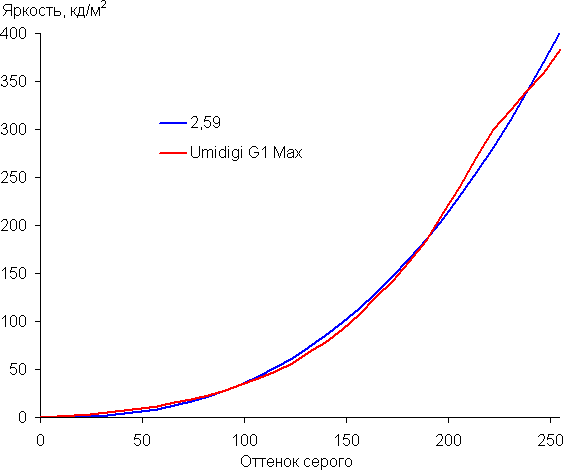 Построенная по 32 точкам с равным интервалом по численному значению оттенка серого гамма-кривая не выявила завала ни в светах, ни в тенях. Показатель аппроксимирующей степенной функции равен 2,59, что выше стандартного значения 2,2, потому и изображение затемнено. Реальная гамма-кривая заметно отклоняется от степенной зависимости: