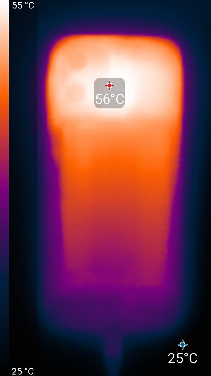 Нагрев больше в верхней части аппарата, что, видимо, соответствует расположению микросхемы SoC. По данным теплокамеры, максимальный нагрев составил 56 градусов (при температуре окружающего воздуха в 24 градуса), это очень высокий нагрев в случае данного теста в сравнении с другими современными смартфонами.