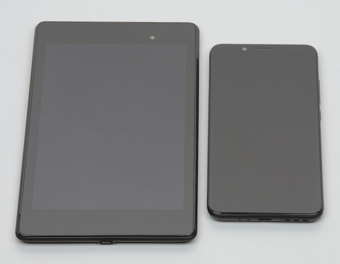Лицевая поверхность экрана выполнена в виде стеклянной пластины с зеркально-гладкой поверхностью, устойчивой к появлению царапин. Судя по отражению объектов, антибликовые свойства экрана примерно как у экрана Google Nexus 7 (2013) (далее просто Nexus 7). Для наглядности приведем фотографию, на которой в выключенных экранах отражается белая поверхность (слева — Nexus 7, справа — Umidigi S2, далее их можно различать по размеру):