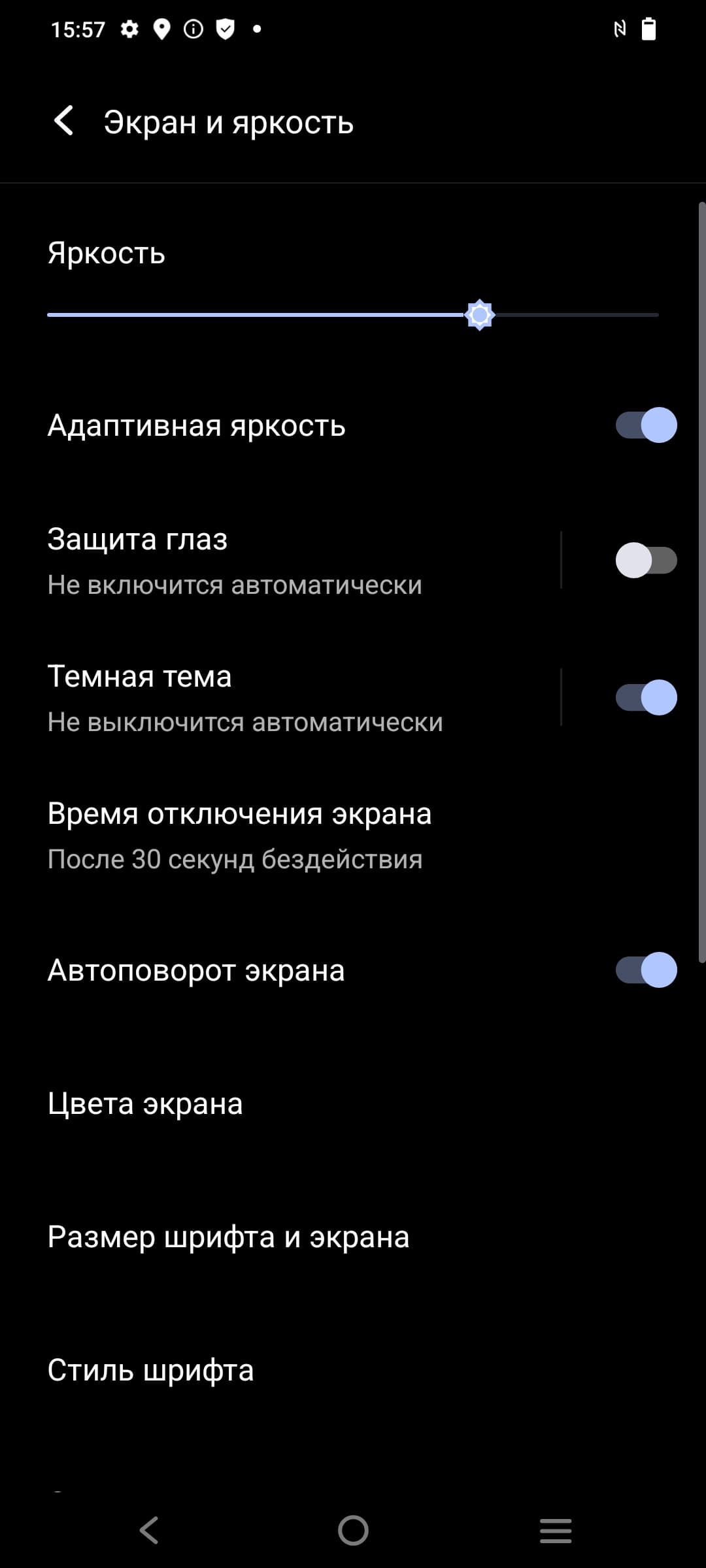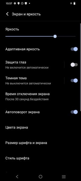 При ручном управлении яркостью и при выводе белого поля во весь экран максимальное значение яркости составило примерно 460 кд/м² в обычных условиях, на очень ярком свету оно может повышаться до 730 кд/м². Максимальная яркость очень высокая. В данном случае чем меньше площадь белого на экране, тем он светлее, то есть фактическая максимальная яркость белых участков будет почти всегда еще выше. В итоге, учитывая отличные антибликовые свойства, читаемость днем на солнце, должна быть на хорошем уровне, а темная тема не только экономит заряд аккумулятора, но способствует лучшей разборчивости информации на экране в условиях высокой освещенности. Минимальное значение яркости при ручном управлении — 2 кд/м², то есть пониженный уровень яркости без проблем позволяет использовать устройство даже в полной темноте. Есть автоматическая регулировка яркости по датчику освещенности (он расположен под экраном справа от фронтальной камеры). В автоматическом режиме при изменении внешних условий освещенности яркость экрана как повышается, так и понижается. Работа этой функции зависит от положения ползунка регулировки яркости: им пользователь может попытаться выставить желаемый уровень яркости в текущих условиях. Если оставить все по умолчанию, то в полной темноте функция автояркости уменьшает яркость до 5 кд/м² (темновато), в условиях освещенного искусственным светом офиса (примерно 550 лк) устанавливает на 80 кд/м² (можно было и ярче), а условно под прямыми лучами солнца повышает до 730 кд/м² (до максимума, так и нужно). Результат нас не совсем устроил, поэтому в полной темноте мы чуть увеличили яркость, получив в итоге для трех условий, указанных выше, следующие значения: 15, 100 и 730 кд/м² (идеальное сочетание). Получается, что функция автоподстройки яркости работает адекватно и позволяет пользователю настраивать свою работу под индивидуальные требования.