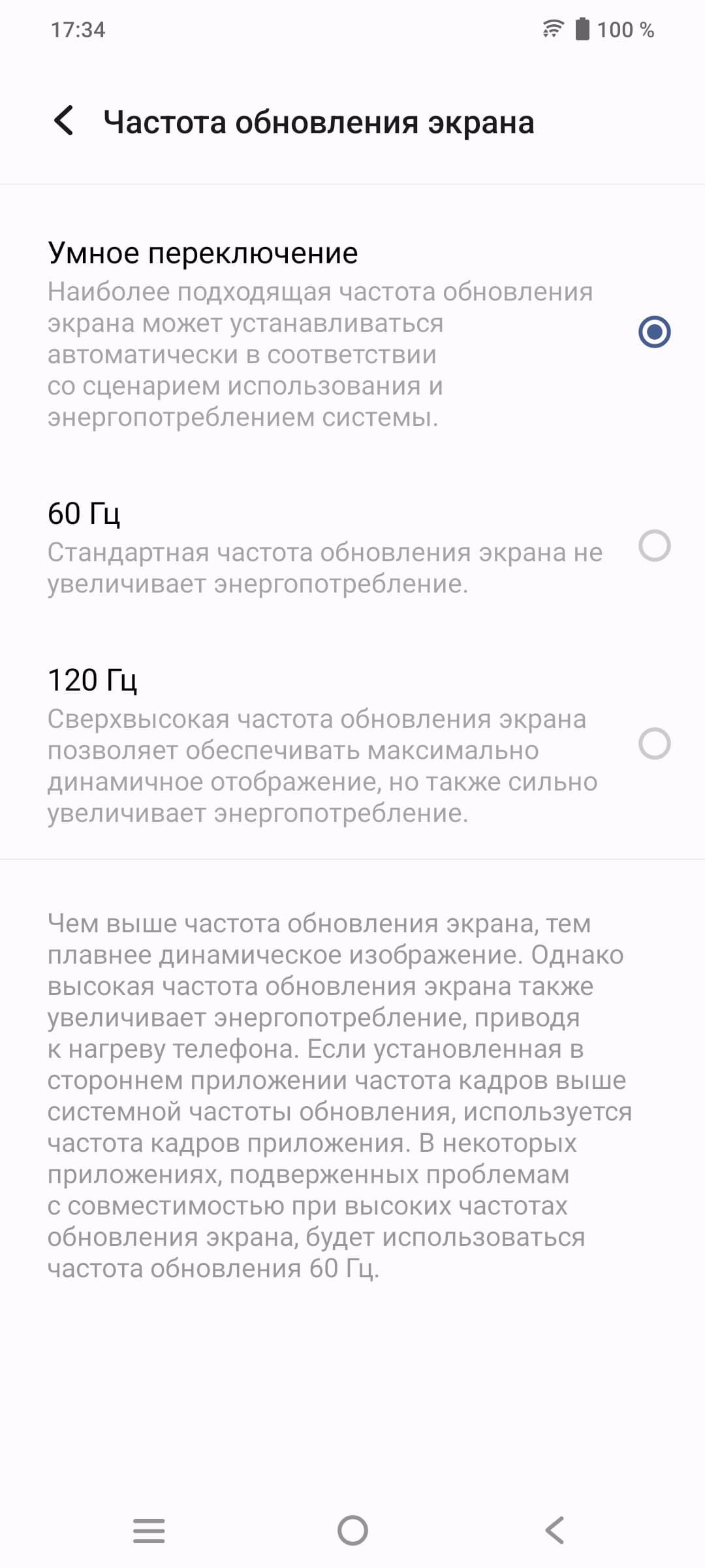 В настройках экрана можно включить режим с повышенной до 120 Гц частотой обновления: