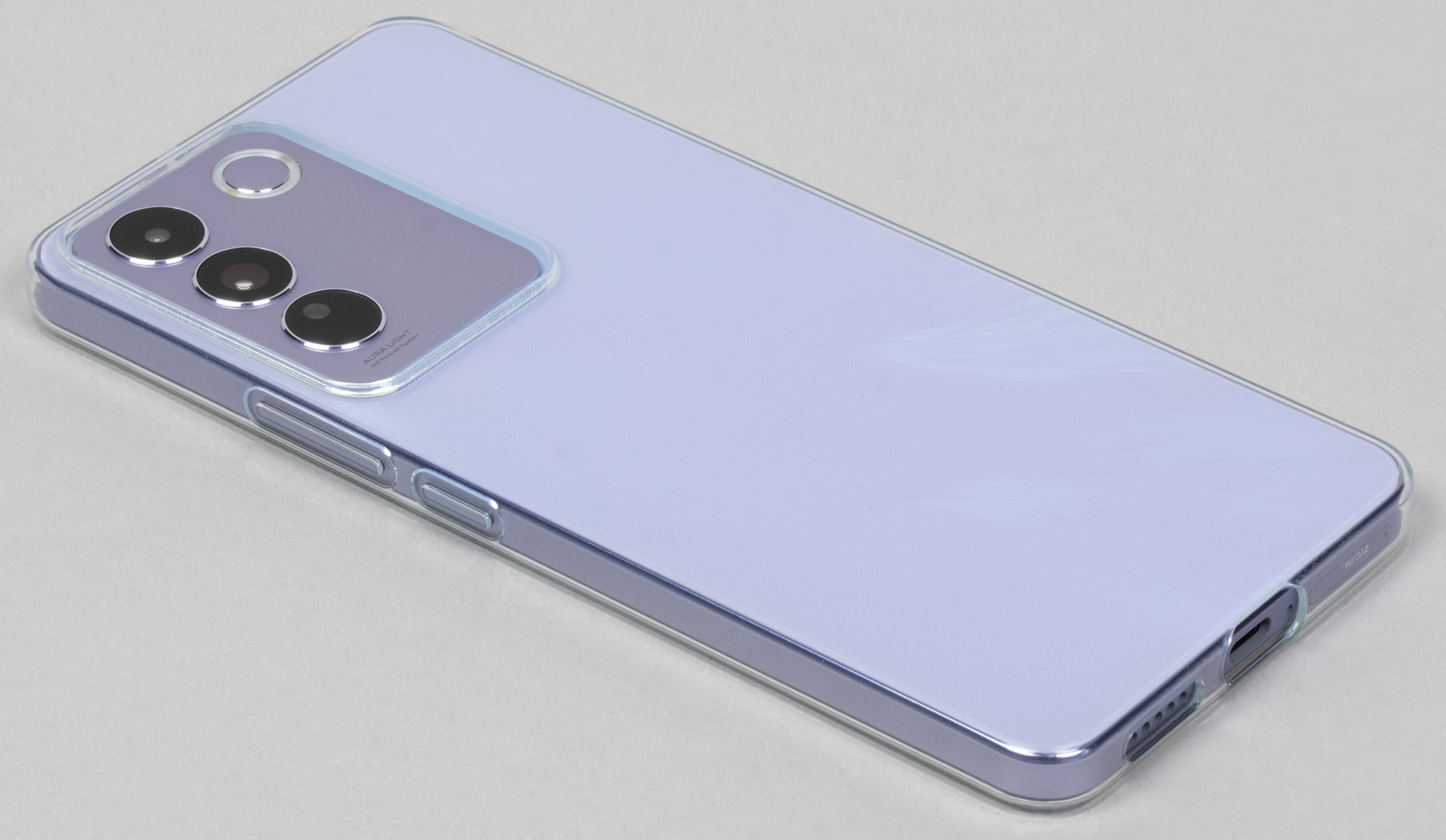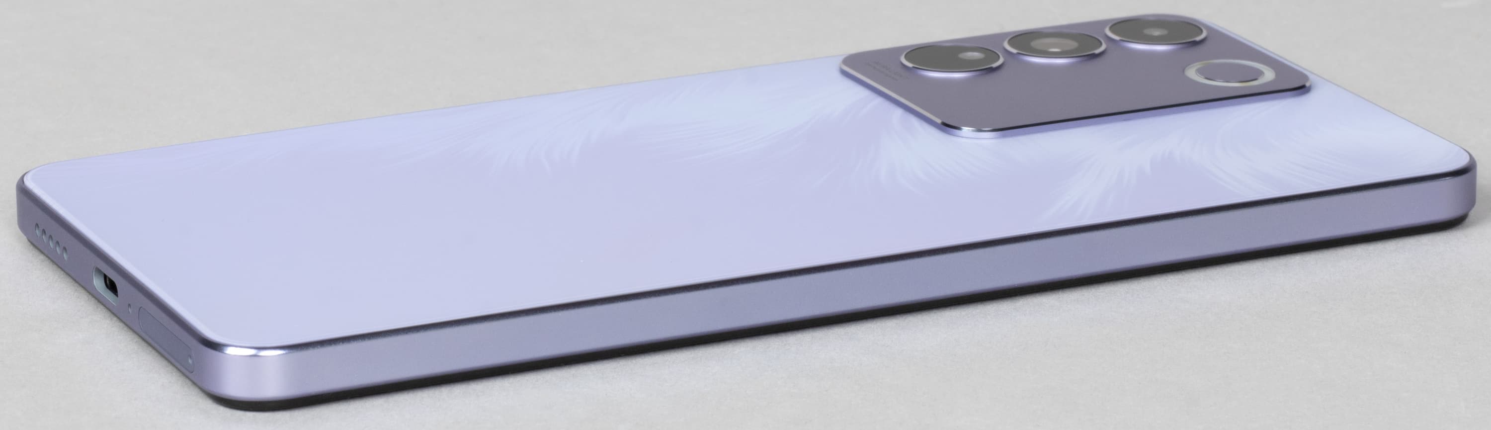Задняя панель выполнена из пластика, как и боковины. Спинка матовая и имеет переливающийся на свету узор (в случае аппарата лавандового оттенка), а боковая рамка имитирует окрашенный метал с блестящей фаской. Переходы на боковины не острые — в кожу ребра не впиваются.