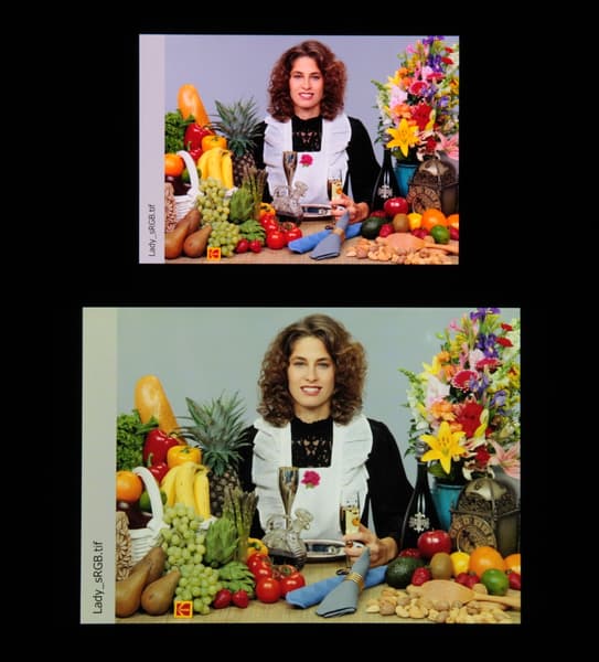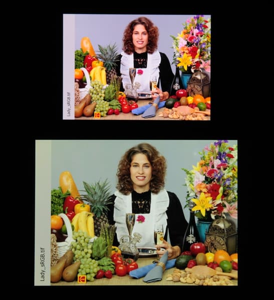 Согласно визуальной оценке, цвета у тестируемого экрана более-менее естественные, а цветовой баланс экранов немного различается. Напомним, что фотография не может служить надежным источником сведений о качестве цветопередачи и приводится только для условной наглядной иллюстрации. В частности, выраженный красноватый оттенок белого и серого полей, присутствующий на фотографиях тестируемого экрана, при перпендикулярном взгляде визуально отсутствует, что подтверждается аппаратными тестами с помощью спектрофотометра. Причина в том, что спектральная чувствительность матрицы фотоаппарата неточно совпадает с этой характеристикой человеческого зрения.