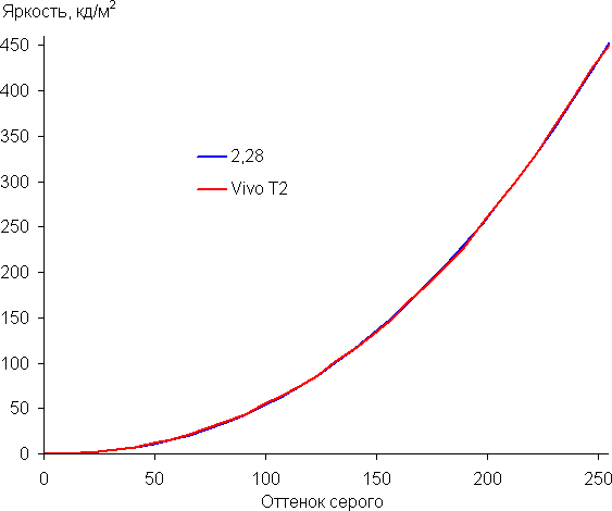 Построенная по 32 точкам с равным интервалом по численному значению оттенка серого гамма-кривая не выявила завала ни в тенях, ни в светах. Показатель аппроксимирующей степенной функции равен 2,28, что немного выше стандартного значения 2,2, при этом реальная гамма-кривая мало отклоняется от степенной зависимости: