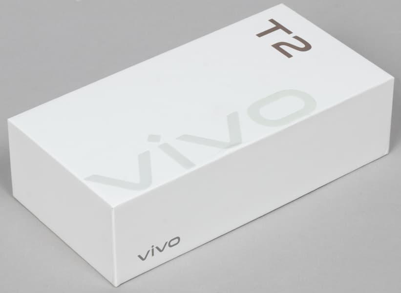 Смартфон Vivo T2 поставляется в твердой картонной упаковке со стильным сдержанным оформлением.