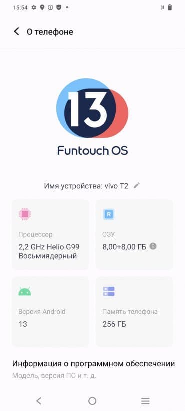 В качестве программной платформы Vivo T2 использует ОС Android 13 с собственной оболочкой Funtouch 13. Предустановлено очень много софта и игр. Верхняя шторка разделена на две части в зависимости от угла оттягивания. Доступ к официальному магазину приложений Google Play и сервисам Google на месте.