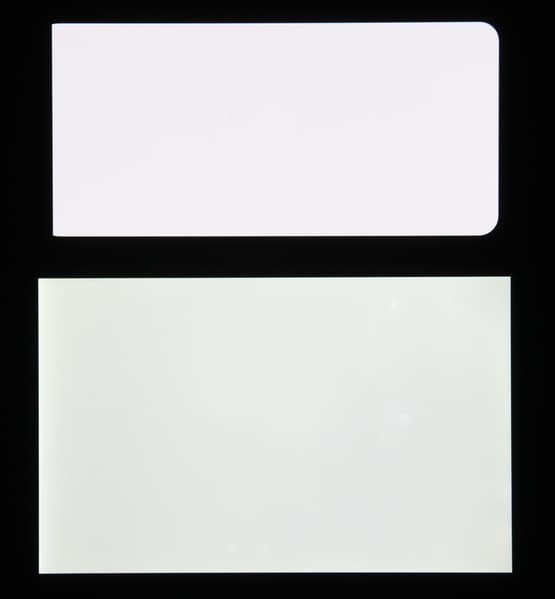 Экран характеризуется великолепными углами обзора. Оттенок белого цвета при отклонении от перпендикуляра к экрану изменяется незначительно, а черный цвет остается черным под любыми углами. Он настолько черный, что параметр контрастности в данном случае просто неприменим. Для сравнения приведем фотографии, на которых на экраны Vivo V17 и второго участника выведены одинаковые изображения, при этом яркость экранов изначально установлена примерно на 200 кд/м², а цветовой баланс на фотоаппарате принудительно переключен на 6500 К.