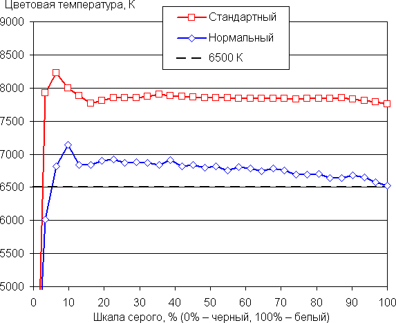 Даже в случае отсутствия коррекции баланс оттенков на шкале серого в случае профиля Нормальный режим приемлемый, так как цветовая температура не сильно выше стандартных 6500 К, а отклонение от спектра абсолютно черного тела (ΔE) ниже 3 единиц, что для потребительского устройства считается отличным показателем. При этом цветовая температура и ΔE мало изменяются от оттенка к оттенку — это положительно сказывается на визуальной оценке цветового баланса. В случае профиля Стандартный режим цветовая температура уже существенно выше 6500 К: