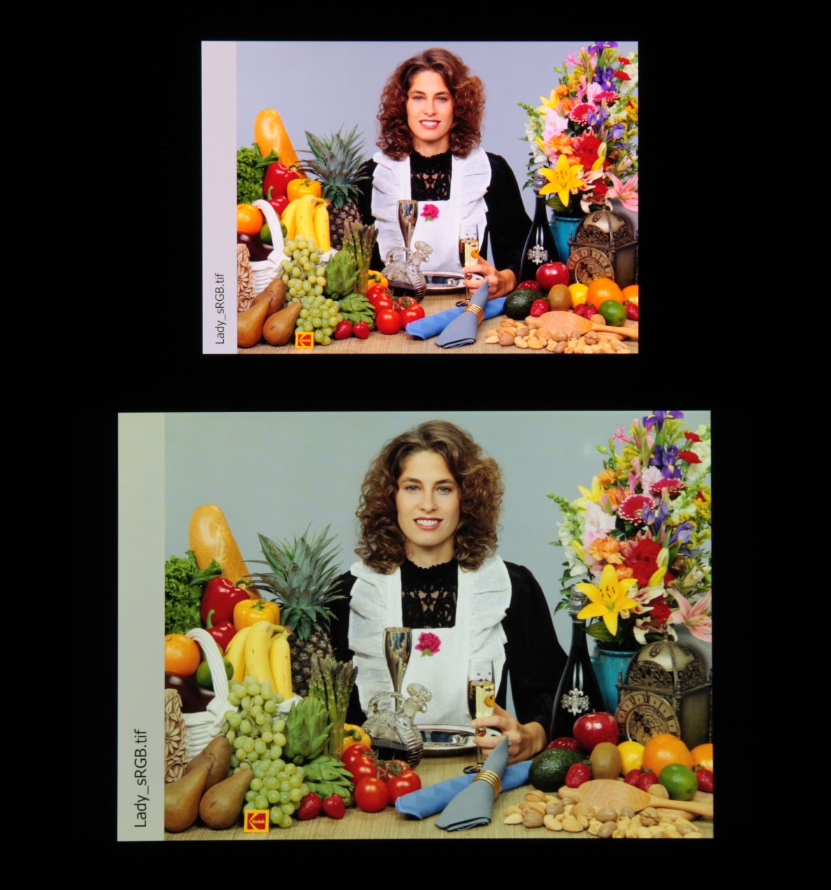 Согласно визуальной оценке, цвета у тестируемого экрана более-менее естественные, а цветовой баланс экранов немного различается. Напомним, что фотография не может служить надежным источником сведений о качестве цветопередачи и приводится только для условной наглядной иллюстрации. В частности, выраженный красноватый оттенок белого и серого полей, присутствующий на фотографиях тестируемого экрана, при перпендикулярном взгляде визуально отсутствует, что подтверждается аппаратными тестами с помощью спектрофотометра. Причина в том, что спектральная чувствительность матрицы фотоаппарата неточно совпадает с этой характеристикой человеческого зрения.