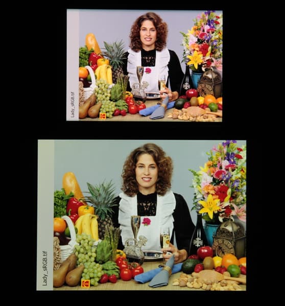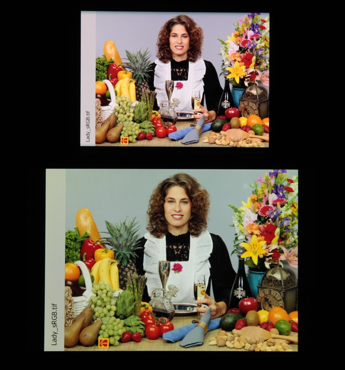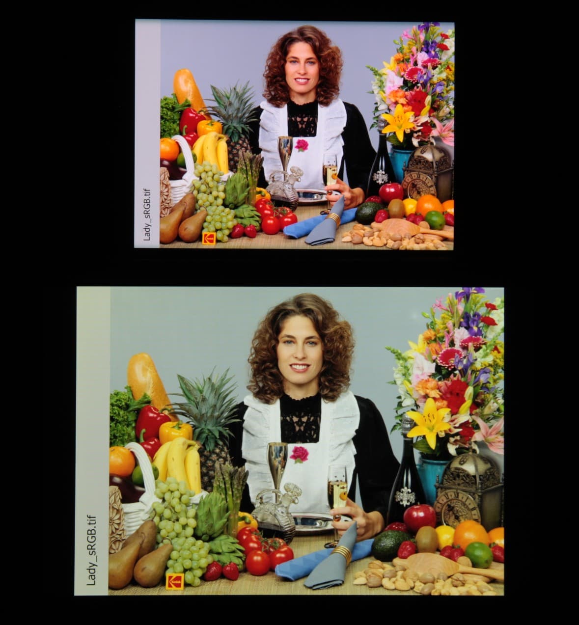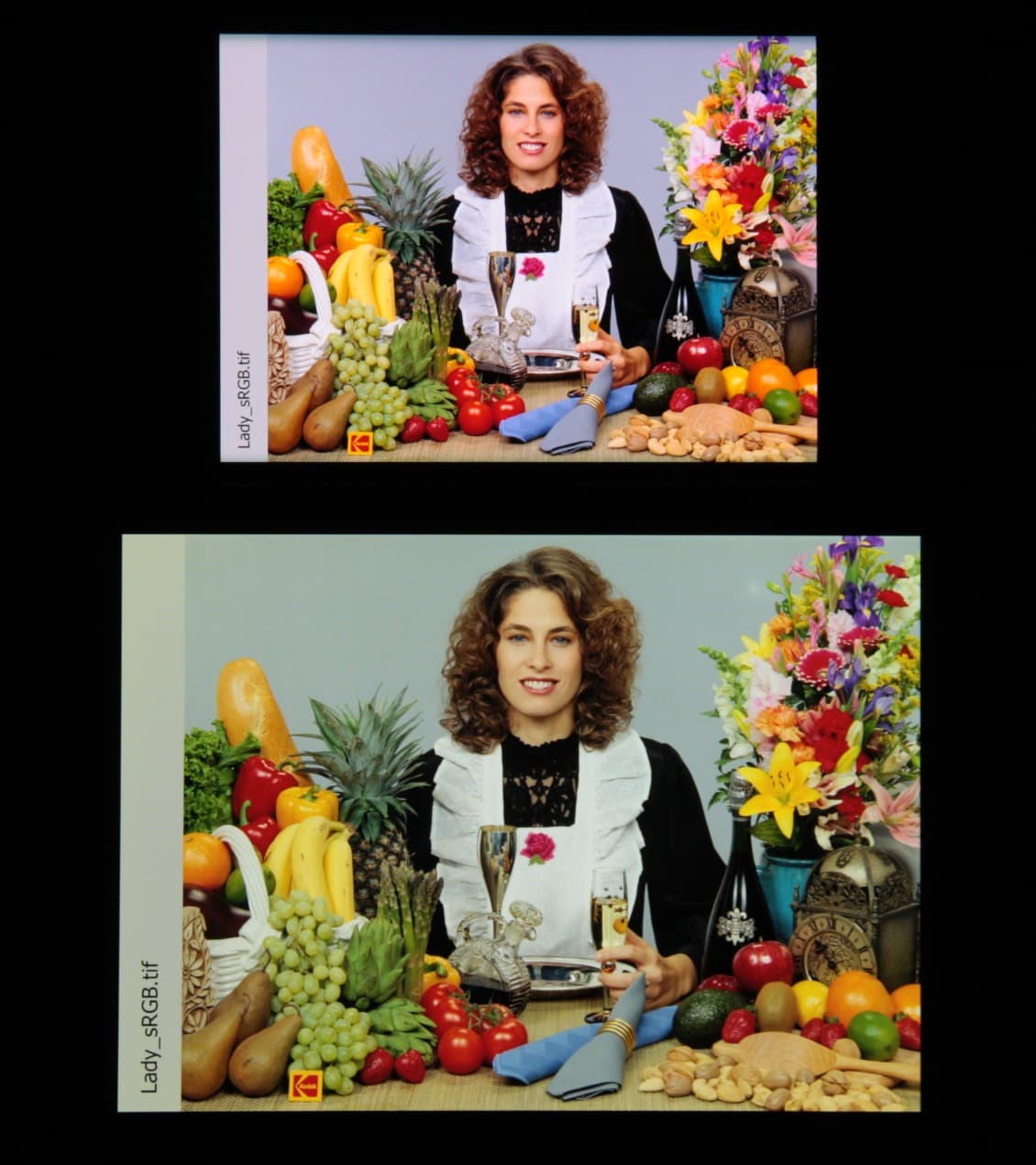 Отметим, что на экранах с широким цветовым охватом без соответствующей коррекции цвета обычных изображений, оптимизированных для устройств sRGB, выглядят неестественно насыщенными. Отсюда и рекомендация: в большинстве случаев смотреть кино, фотографии и все естественное лучше при выборе профиля Профессиональный. Профиль Стандарт уместен при просмотре материала с охватом DCI-P3, принятым в цифровом кинематографе, но в быту встречающимся редко.
