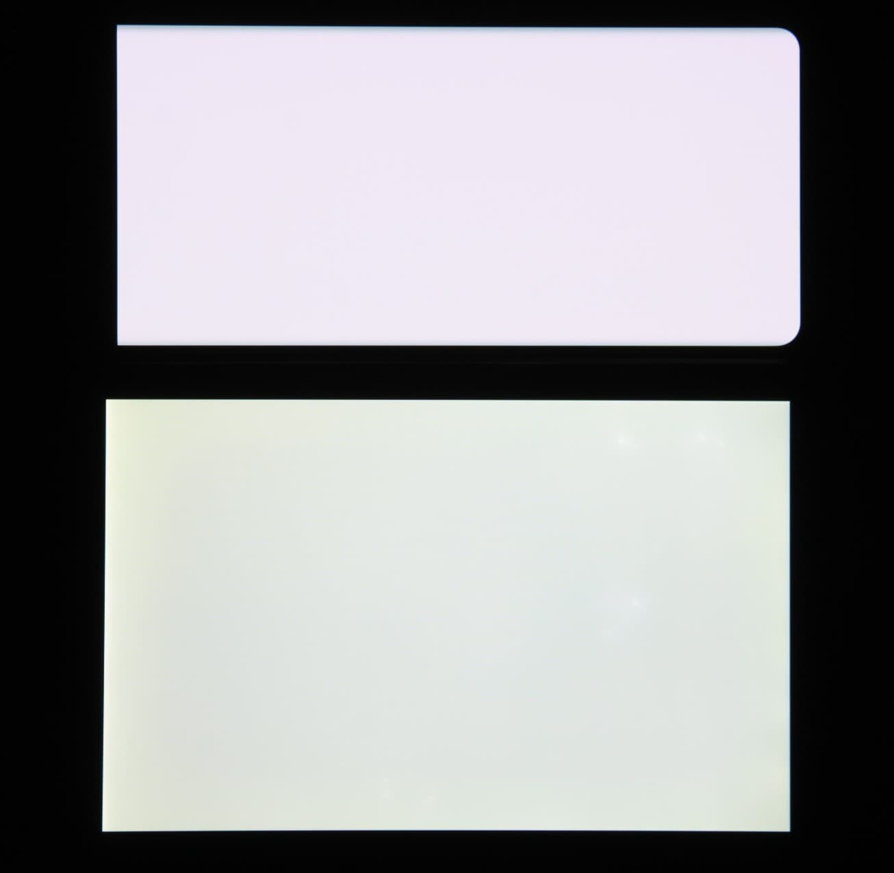 Отметим хорошую равномерность яркости и цветового тона белого поля (за исключением едва видимого затемнения и изменения оттенка к загнутым краям).