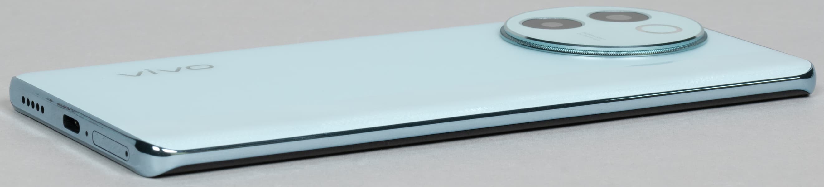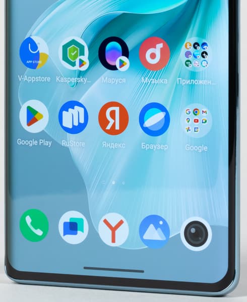 Корпус смартфона Vivo V30e выполнен в обтекаемом дизайне с загнутыми панелями и зауженными боками. Крепко удерживать такой смартфон в ладони не получится — он прокручивается и проскальзывает, потому что боковых граней практически нет, всё заужено и закруглено. Пресловутый экран-водопад имеет бликующие края с искажением цветов.