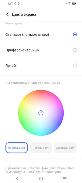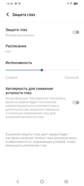 Разумеется, присутствует настройка (Защита глаз), позволяющая снизить интенсивность синей компоненты: