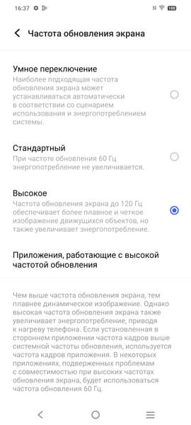 В настройках экрана можно включить режим с повышенной до 120 Гц частотой обновления: