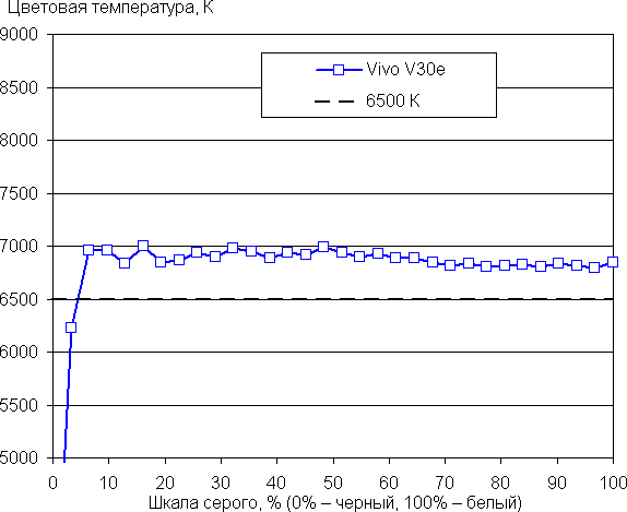 Даже в случае отсутствия дополнительной коррекции баланс оттенков на шкале серого в случае профиля Профессиональный хороший, так как цветовая температура достаточно близка к стандартным 6500 К, а отклонение от спектра абсолютно черного тела (ΔE) ниже 10 единиц, что для потребительского устройства считается приемлемым показателем. При этом цветовая температура и ΔE мало изменяются от оттенка к оттенку — это положительно сказывается на визуальной оценке цветового баланса: