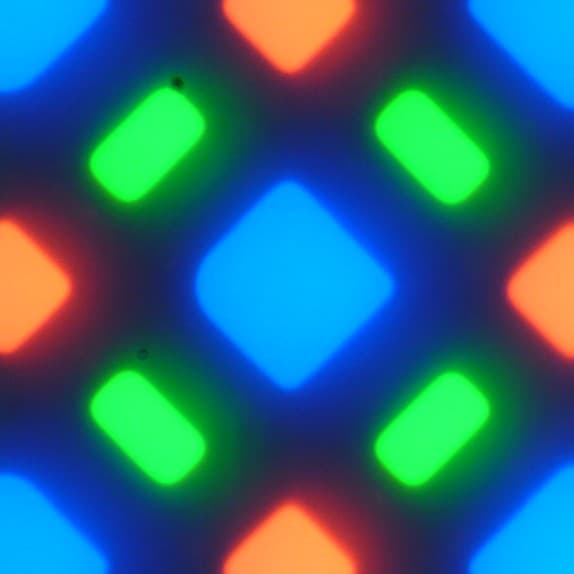 В этом экране используется матрица AMOLED — активная матрица на органических светодиодах. Полноцветное изображение создается с помощью субпикселей трех цветов — красного (R), зеленого (G) и синего (B), но красных и синих субпикселей в два раза меньше, что можно обозначить как RGBG. Это подтверждается фрагментом микрофотографии: