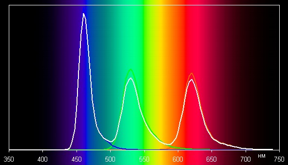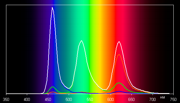 Без коррекции (вариант Яркий) спектры компонент (то есть спектры чистых красного, зеленого и синего цветов) очень хорошо разделены: