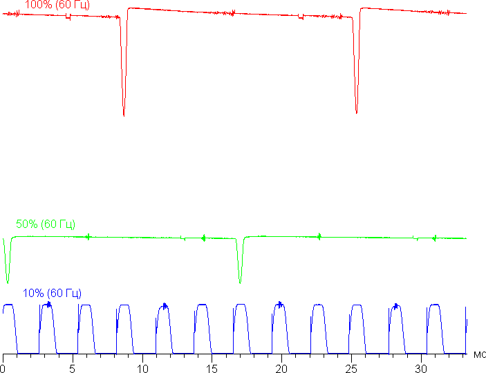 На высоком и среднем уровне яркости присутствует значимая модуляция с частотой примерно 60 или 120 Гц. На рисунке ниже приведены зависимости яркости (вертикальная ось) от времени (горизонтальная ось) для нескольких значений настройки яркости. Сначала для режима с частотой обновления 60 Гц: